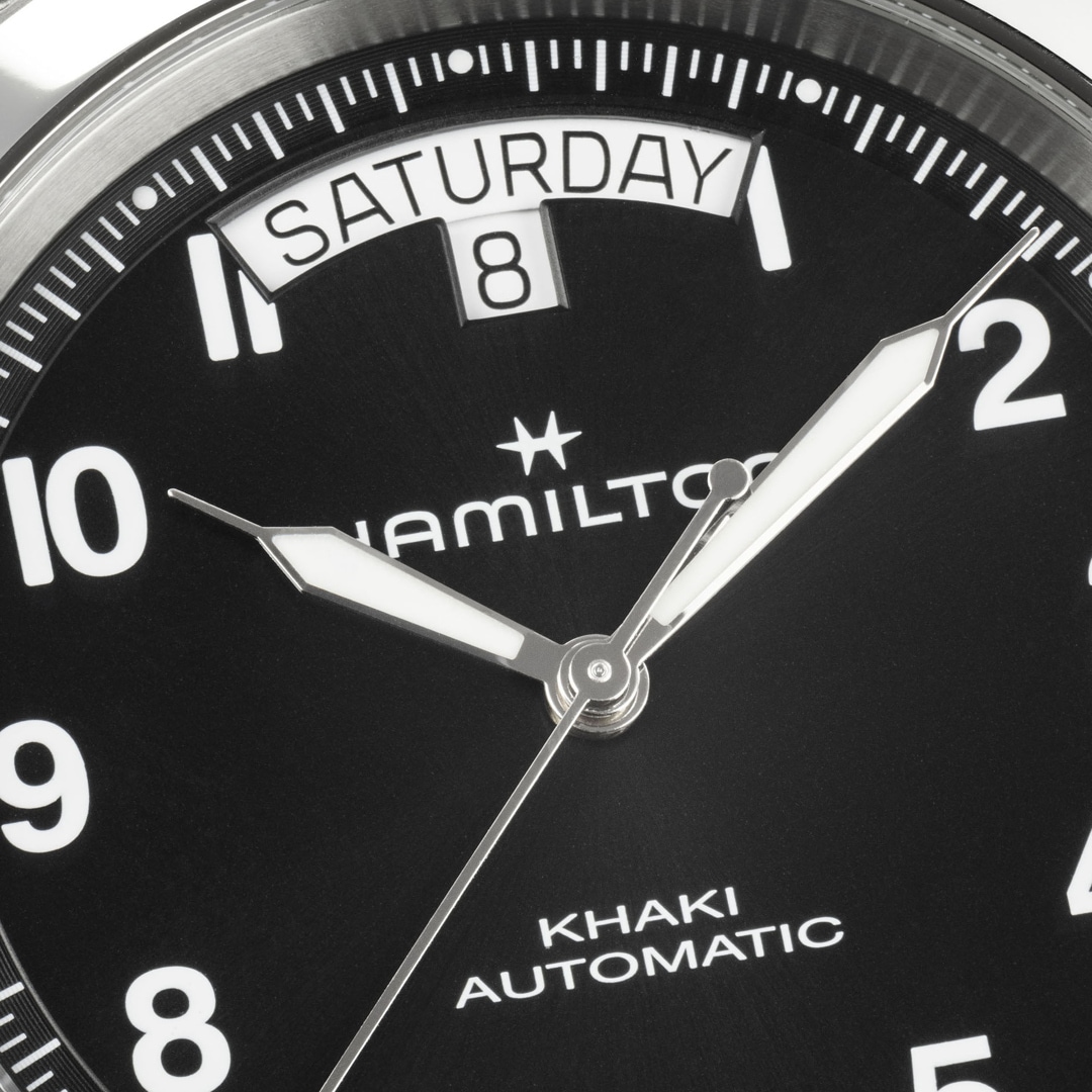 Robust und elegant zugleich präsentiert sich die Khaki Field King 40 mm mit einem schwarzen, gebürsteten Zifferblatt mit Sonnenschliff und einem braunen Lederarmband mit Ziernähten für einen Look, der Abenteuerlust und Tradition vereint. Die charakteristische Tages- und Datumsanzeige bei 12 Uhr sowie die vom Militärdesign übernommenen Zeitindizes verweisen auf die Herkunft der Uhr. Der speziell entwickelte Kronenschutz gewährleistet Langlebigkeit in jeder Art von Umgebung. Mit einer Wasserdichtigkeit von 10 bar und einer Antireflexbeschichtung ist diese Outdoor-Uhr auf Klarheit und Zuverlässigkeit ausgelegt – long live the King.