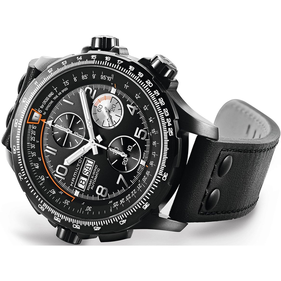 Das rasante schwarze PVD-Design unterstreicht die Nähe zur Fliegerei und stellt ihren guten Ruf für hohe Präzision und ausgefeilte Technik heraus. Ein schwarzes Lederarmband macht das gute Aussehen der dunklen Schönheit perfekt: Die neue Generation der Khaki X-Wind Auto Chrono mit einem robusten 45-mm-Durchmesser zeichnet sich durch fünf wuchtige Seitenelemente in X-Form und kontrastierende, silberfarbene Details aus. Sie spielt in einer anderen Liga Selbstverständlich ist in dem Edelstahlgehäuse mit PVD-Beschichtung der neuesten Khaki X-Wind Auto Chrono Version auch die spezielle Besonderheit der X-Wind untergebracht: der Driftwinkelrechner, der weltweit erstmalig in einer Uhr eingebaut wurde. Damit können Piloten Seitenwinde auf ihrer geplanten Flugstrecke präzise berechnen und aufzeichnen. Die bis zu einem Druck von 10 bar (100 Meter) wasserdichte Khaki X-Wind Auto Chrono wird von einem automatischen Schweizer ETA Valjoux 7750 Chronographenwerk angetrieben, das zum Hamilton-Kaliber H-21 abgewandelt und dessen Gangreserve so auf kraftvolle 60 Stunden erhöht wurde. Jeder der drei Zähler ist mit einer stilisierten Metallauflage versehen, die durch zweifarbig gebürstete Metalldetails rund um die Wochentags- und Datumsfenster ergänzt wird. Das Ganze fügt sich zu einem einmaligen Industrie-Look mit einem faszinierenden 3D-Effekt.