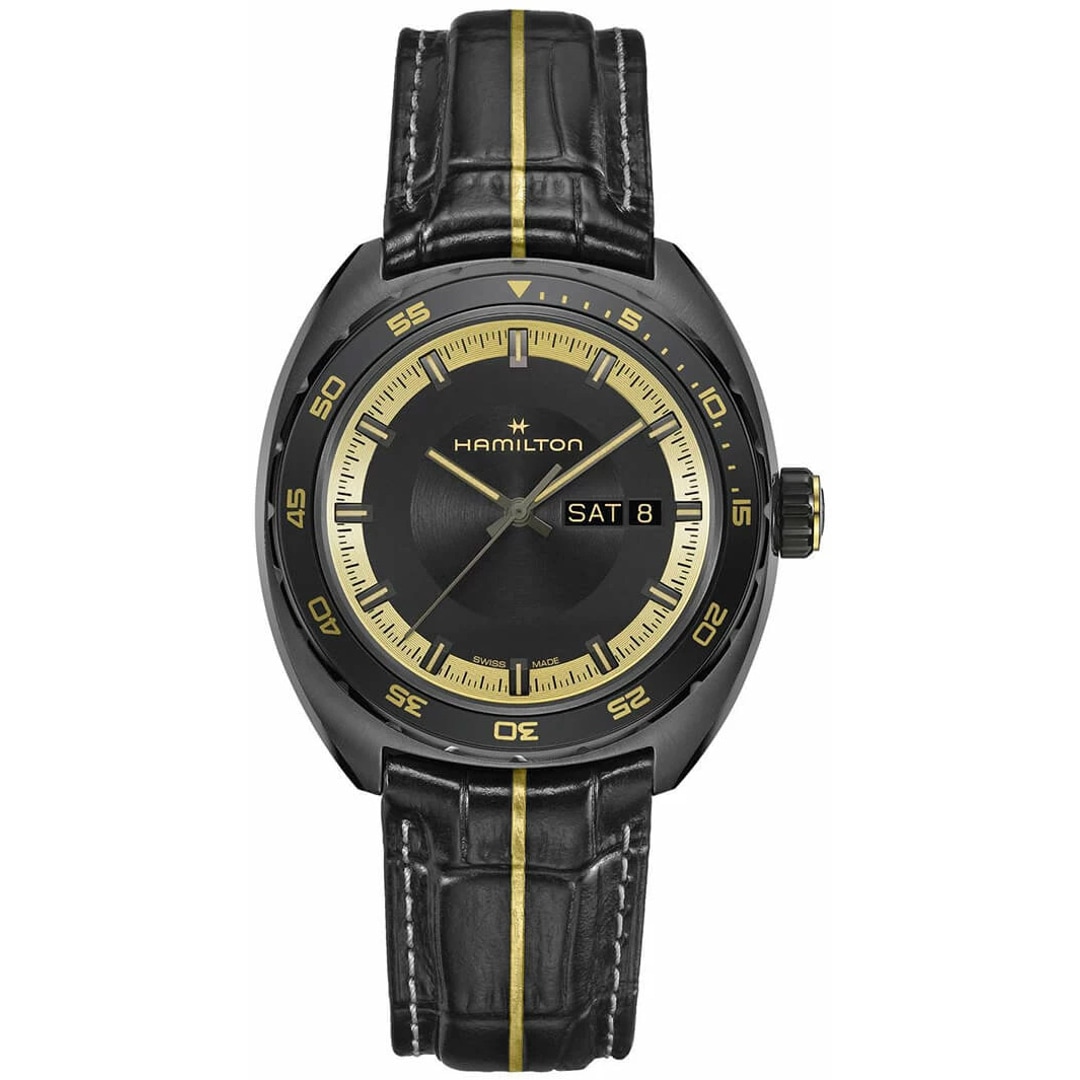 In der packenden Welt von Resident Evil Requiem ist die Hamilton Pan Europ die verlässliche Begleiterin der brillanten Analystin Grace Ashcroft. Diese exklusive Special Edition spiegelt die Intelligenz und die analytische Schärfe ihres Charakters perfekt wider. Das markante Design überzeugt durch ein schwarzes PVD-beschichtetes Gehäuse und ein Zifferblatt, das durch goldene Akzente eine kraftvolle Eleganz ausstrahlt.