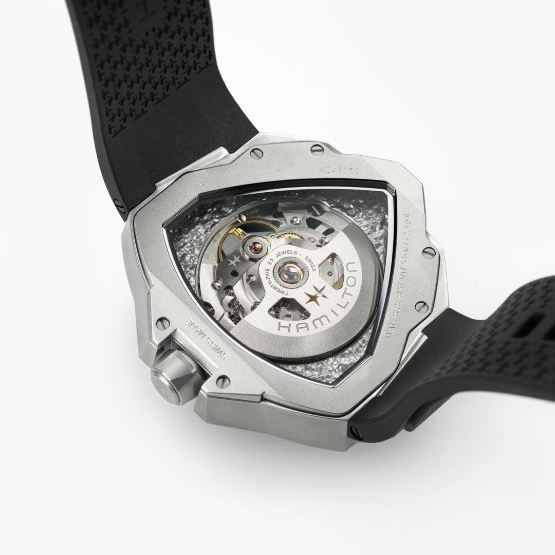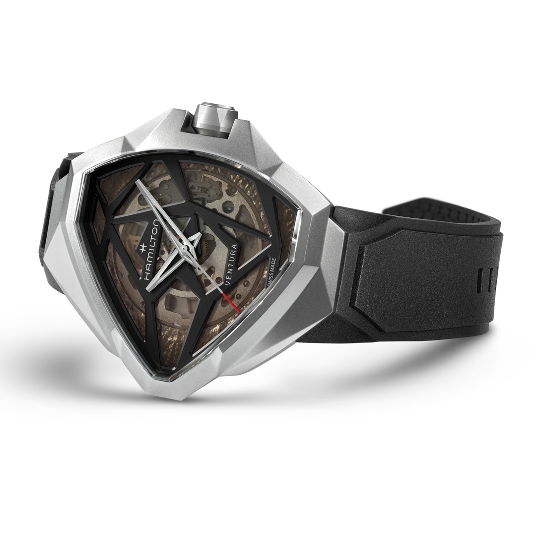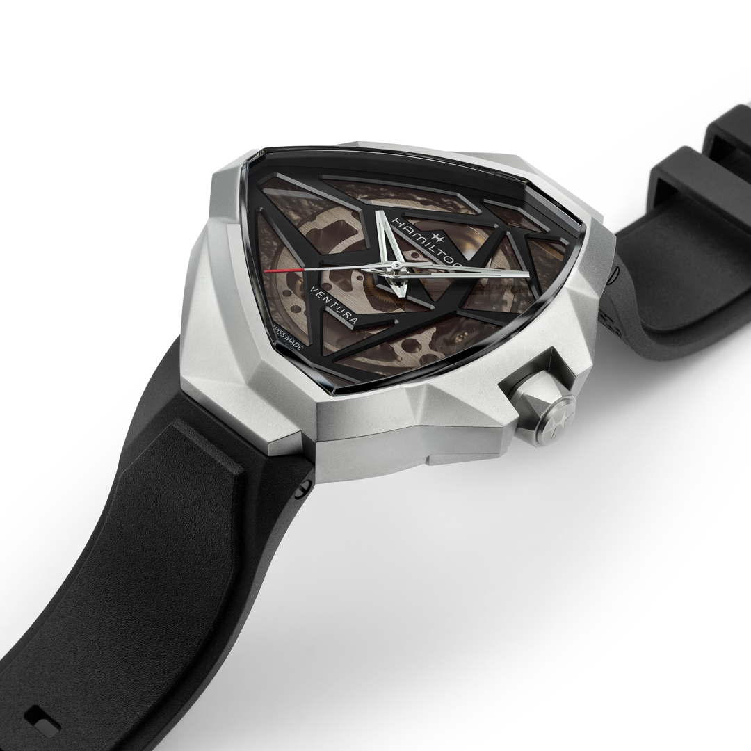 Die Ventura Edge Skeleton setzt sich über alle Konventionen hinweg und wagt den Sprung in die Zukunft der Uhrmacherkunst. Sie löst sich von der ikonischen dreieckigen Ventura-Gehäusestruktur und präsentiert sich in einem gewagten neuen architektonischen Design. Das dunkle, geheimnisvoll und avantgardistisch gehaltene Design spielt mit Licht und Schatten, was seiner Form eine fast überirdische Tiefe verleiht. Das Herzstück des von einem kontrastierenden silbernen Stahlgehäuse umrahmten Zeitmessers ist das Uhrwerk H-10-S, das durch ein skelettiertes Zifferblatt mit Farbverlauf schrittweise sichtbar wird. Dieser Zeitmesser wird mit einem schwarzen Kautschukarmband geliefert.