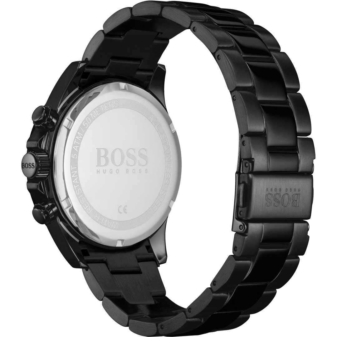 Maskuline BOSS Uhr, die robuste Funktionalität mit edlem Stil vereint. Der Herren-Chronograph aus schwarz beschichtetem Edelstahl präsentiert sich mit einer praktischen Tachymeter-Lünette und einem Kronenschutz. Dank der leuchtenden Indizes ist die Uhrzeit auch bei schlechten Lichtverhältnissen gut zu erkennen. Ein Gliederarmband rundet das Design ab – vielseitig kombinierbares Accessoire für jeden Tag.