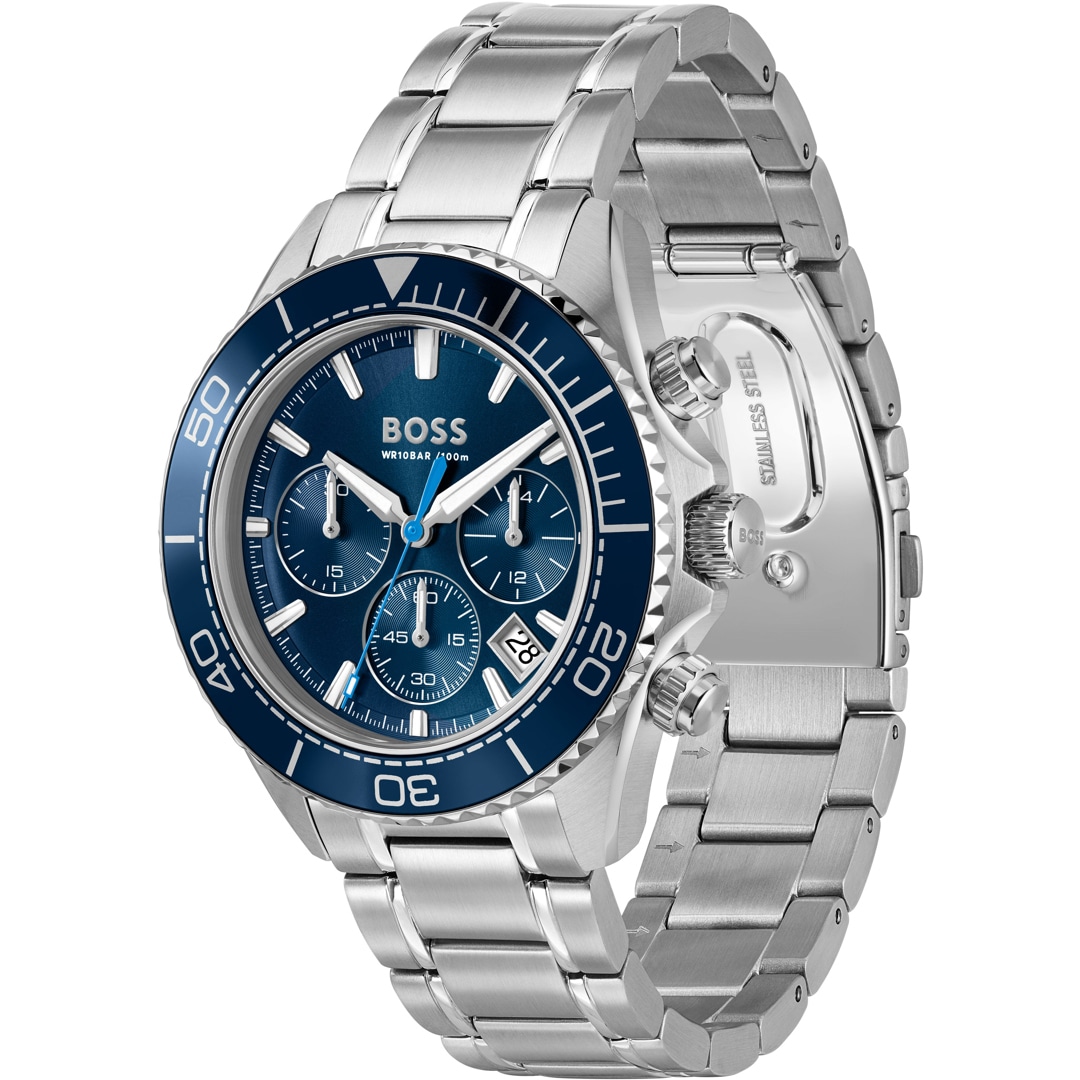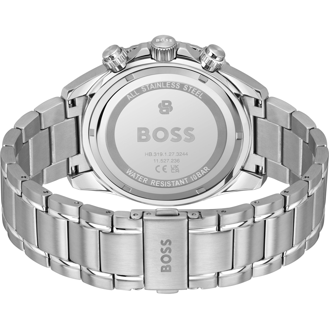 Eleganter BOSS Chronograph. Das maskuline Herren-Accessoire ist aus Edelstahl mit gebürstetem und poliertem Finish gefertigt. Ein Zifferblatt mit Sonnenschliff setzt sportive Akzente. Ein geschützter Knopf, ein hochwertiges Armband sorgen für eine edle Note. Leuchtende Zeiger und Stundenindizes sorgen für optimale Lesbarkeit im Dunkeln.