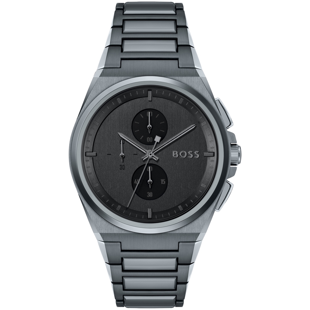 Puristische BOSS Uhr mit drei Zeigern. Das Herren-Accessoire aus Edelstahl mit grauem Finish ist mit abgeschrägten Bandanstössen und Gliedern versehen, die Gehäuse und Armband nahtlos miteinander verbinden. Das Ton in Ton gehaltene und vertikal gebürstete Zifferblatt präsentiert sich mit polierten Zeigern und minimalistischen Indizes.