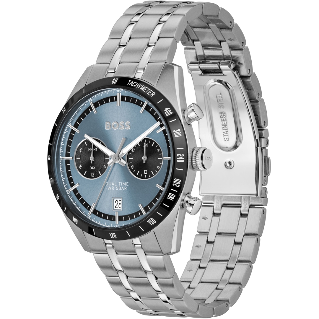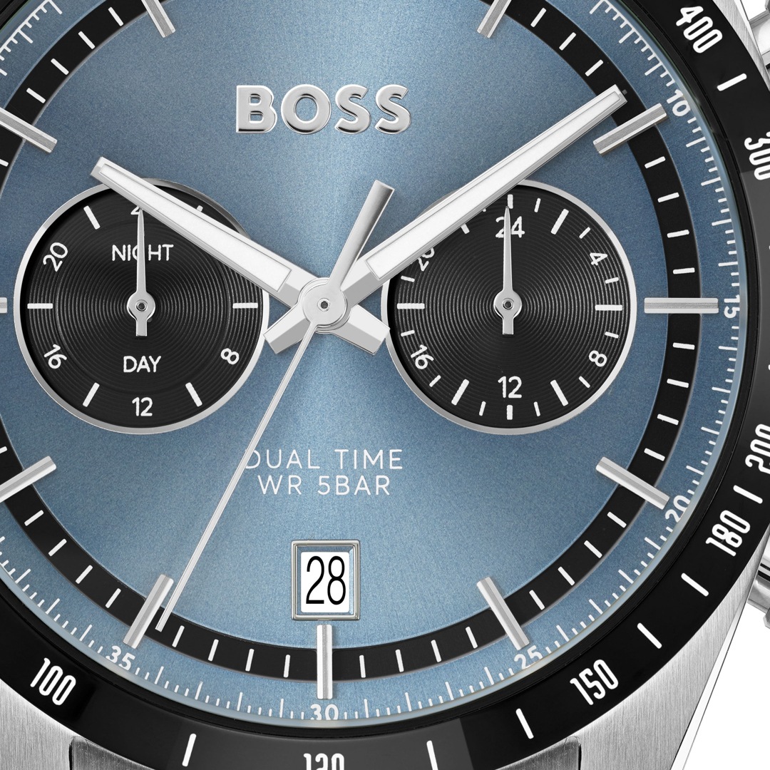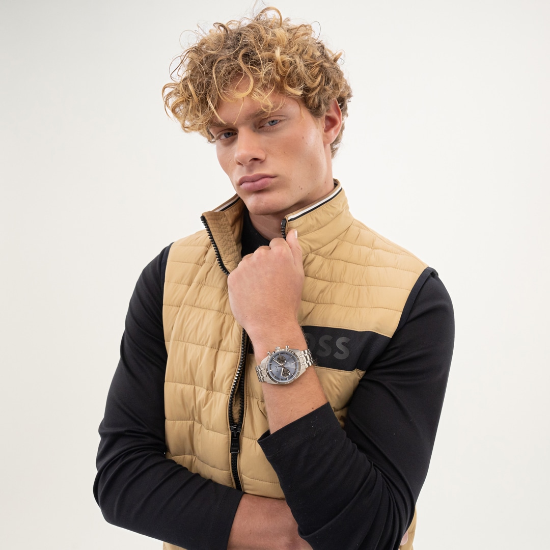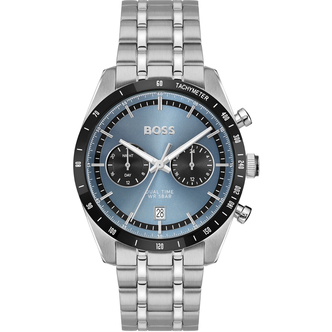 Schlichtes Design trifft auf hohen Tragekomfort: Die präzise gefertigte BOSS Uhr aus gebürstetem und poliertem Edelstahl ist mit einem tollen Armbandversehen. Die Herren-Uhr mit Dual Time Funktion verfügt über ein aufregendes Zifferblatt mit Strich-Indizes und zwei abgesetzten Totalisatoren, einer Datumsanzeige, die den zeitlosen Charme des Accessoires ergänzt. Runden Sie Ihre Looks mit diesem makellos gefertigten Style souverän ab – der perfekte Begleiter für jeden Tag.