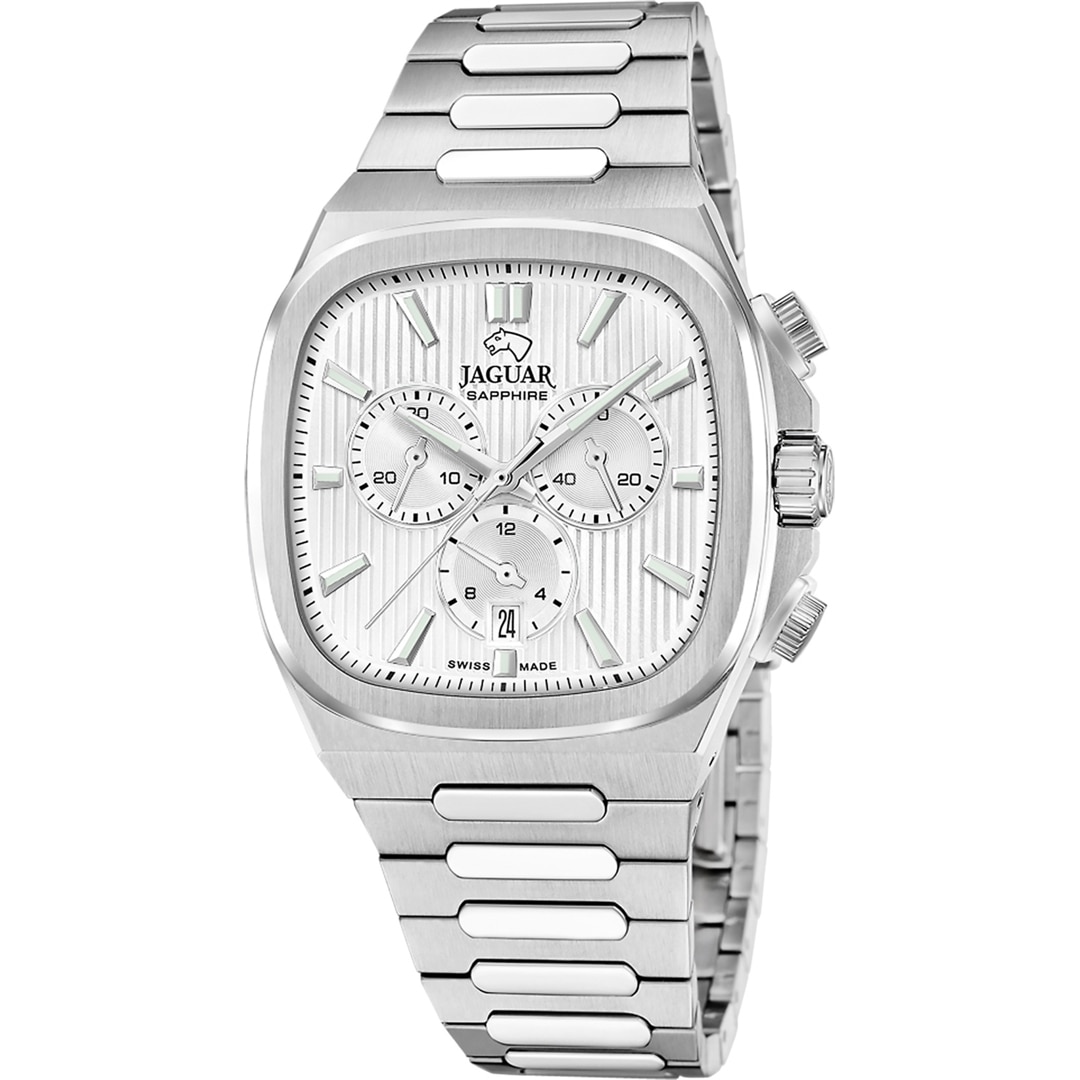 Die Jaguar Swiss Made Herren Chronographen vereinen klassische Schweizer Uhrmacherkunst mit modernem, zeitlosen Design. Das robuste Edelstahlgehäuse sorgt für Langlebigkeit, während das kratzfeste Saphirglas das Zifferblatt optimal schützt und jederzeit klare Ablesbarkeit garantiert. Angetrieben von einem präzisen Schweizer Quarzwerk bieten die Uhren zuverlässige Zeitmessung sowie nützliche Funktionen wie Chronograph mit Stoppfunktion, 30-Minuten- und 12-Stunden-Zähler sowie Datumsanzeige. Das Edelstahlarmband mit Butterfly-Schliesse gewährleistet hohen Tragekomfort und sicheren Halt. Mit ihrer Wasserdichtigkeit von 5 ATM sind die Uhren spritzwassergeschützt und für den Alltag bestens geeignet.