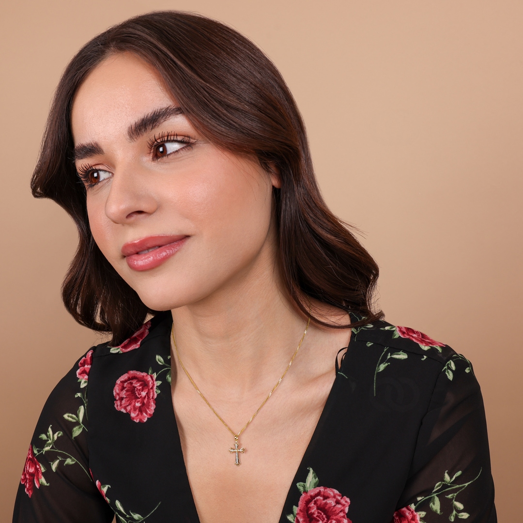 Dieser Kreuzanhänger aus 18 Karat Gelbgold vereint zeitlose Eleganz und spirituelle Symbolik auf beeindruckende Weise. Das edle Gelbgold bildet die perfekte Grundlage für die 17 funkelnden Diamanten, die das Kreuz kunstvoll schmücken und ihm einen strahlenden Glanz verleihen. Jeder Diamant fängt das Licht ein und reflektiert es in einem bezaubernden Spiel von Brillanz und Feuer. Dieses exquisite Schmuckstück ist nicht nur ein Ausdruck tiefen Glaubens, sondern auch ein stilvolles Accessoire, das jeden Anlass veredelt und seine Trägerin mit einem Hauch von Luxus umgibt.