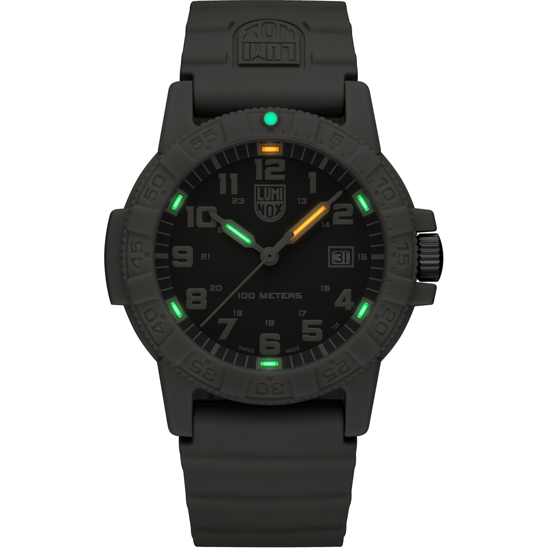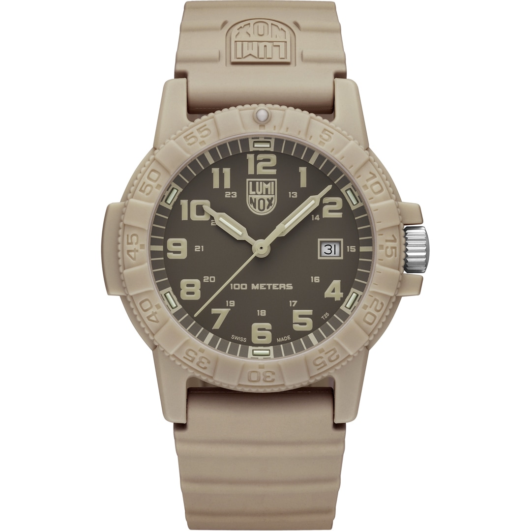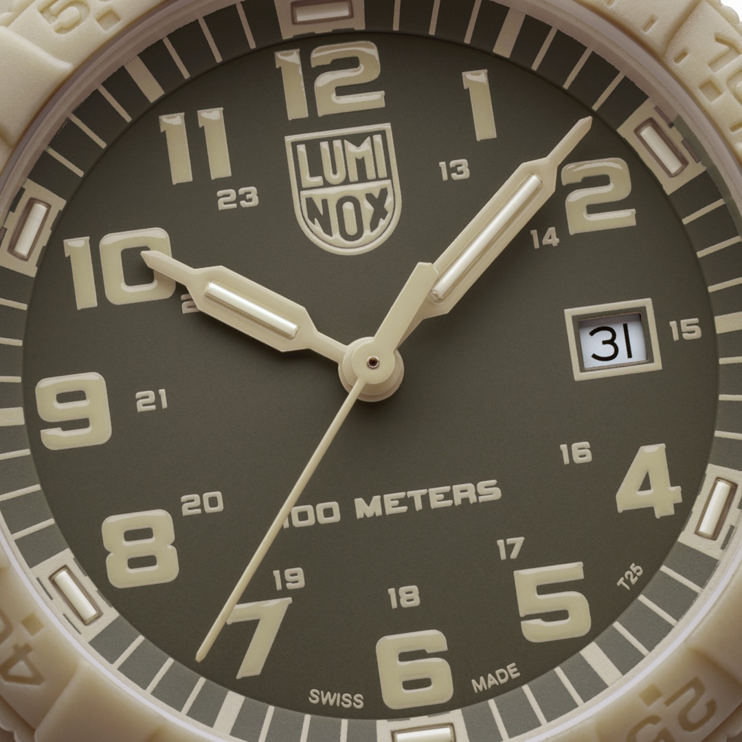Das monochrome Design dieser Leatherback Sea Turtle Uhr ist von weiten Wüstenlandschaften und dem Geist der Entdeckung inspiriert. In Anlehnung an die Widerstandsfähigkeit der Lederschildkröte überträgt die Uhr die im Ozean bewährte Robustheit auf eine leichte und dennoch robuste Funktionsuhr. Das markante 44 mm Gehäuse in Schildkrötenform besteht aus sandfarbenem Fiberglas und verfügt über eine geschützte Krone sowie eine passende einseitig drehbare Lünette. Zusammen mit dem sandfarbenen PU-Kautschukarmband entsteht ein harmonisch abgestimmtes Design mit subtiler Camouflage-Ästhetik – aussergewöhnlich leicht und zugleich äusserst strapazierfähig. Angetrieben von einem Schweizer RONDA 515 Quarzwerk und wasserdicht bis 100 Meter, ist die Sand Turtle zudem mit der Luminox Light Technology (LLT) ausgestattet. Diese sorgt bei allen Lichtverhältnissen für konstante Ablesbarkeit – bis zu 25 Jahre lang, ganz ohne externe Energiequelle.