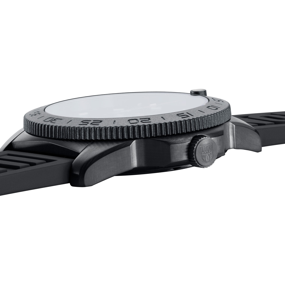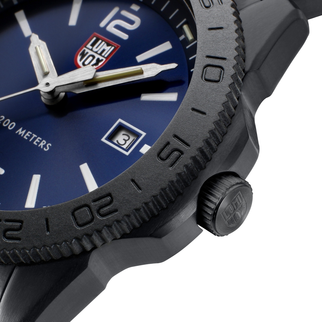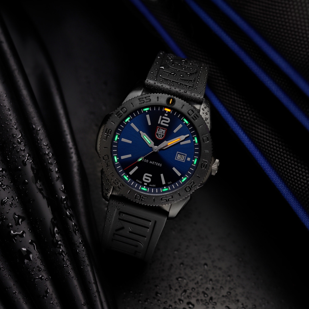 In dieser Taucheruhr treffen kräftige Farben auf robuste Leistung. Die Pacific Diver 3120 Serie verfügt über ein 44 mm grosses IP-beschichtetes schwarzes Edelstahlgehäuse mit einer einseitig drehbaren CARBONOX™-Lünette, die für Langlebigkeit sorgt und trotzdem angenehm leicht bleibt. Das ozeanblaue Zifferblatt mit Sonnenschliff bietet ein kontrastreiches Display, das ebenso auffällig wie funktional ist. Ausgestattet mit Luminox Light Technologie für konstantes Leuchten bei schlechten Lichtverhältnissen und völliger Dunkelheit ist diese Uhr immer einsatzbereit. Das schwarze, auf die gewünschte Länge zuschneidbare Armband passt sich allen Handgelenkgrössen an. Mit einer Wasserdichtigkeit von 200 Metern, einer verschraubbaren Krone und einem Saphirglas mit Antireflexbeschichtung ist die Pacific Diver ein zuverlässiger Begleiter, egal ob über oder unter dem Wasser.