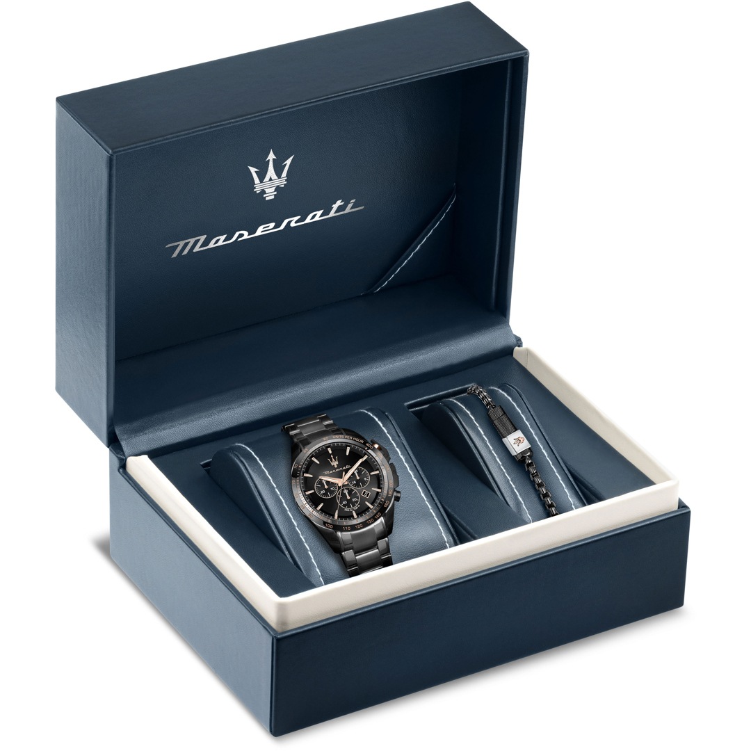 Die technische Perfektion und die Liebe für Details, die Maserati in jedes seiner Autos steckt, spiegelt sich bei den Uhren mit ihrem unverwechselbaren Stil wider. Sie nehmen mit originellen, edlen Kreationen die legendärsten Elemente der Geschichte und des Designs der Firma des Dreizacks wieder auf. Freunde des Motorsports aufgepasst! Mit der Traguardo kreiert Maserati eine Kollektion, welche in Puncto Sportlichkeit nicht zu überbieten ist! Das Zifferblatt trumpft mit seiner Chronographen Funktion gross auf. Ein weiteres Highlight von diesem Modell der Traguardo Kollektion ist die klassische Tachymeter-Skala, die für jeden Geschwindigkeits-Freak ein absolutes Must-have ist. Das Armband bietet zudem optimalen Komfort. Als krönenden Abschluss dient hier der majestätische Dreizack, welcher auf dem Zifferblatt einen eleganten Einzug erhalten hat.