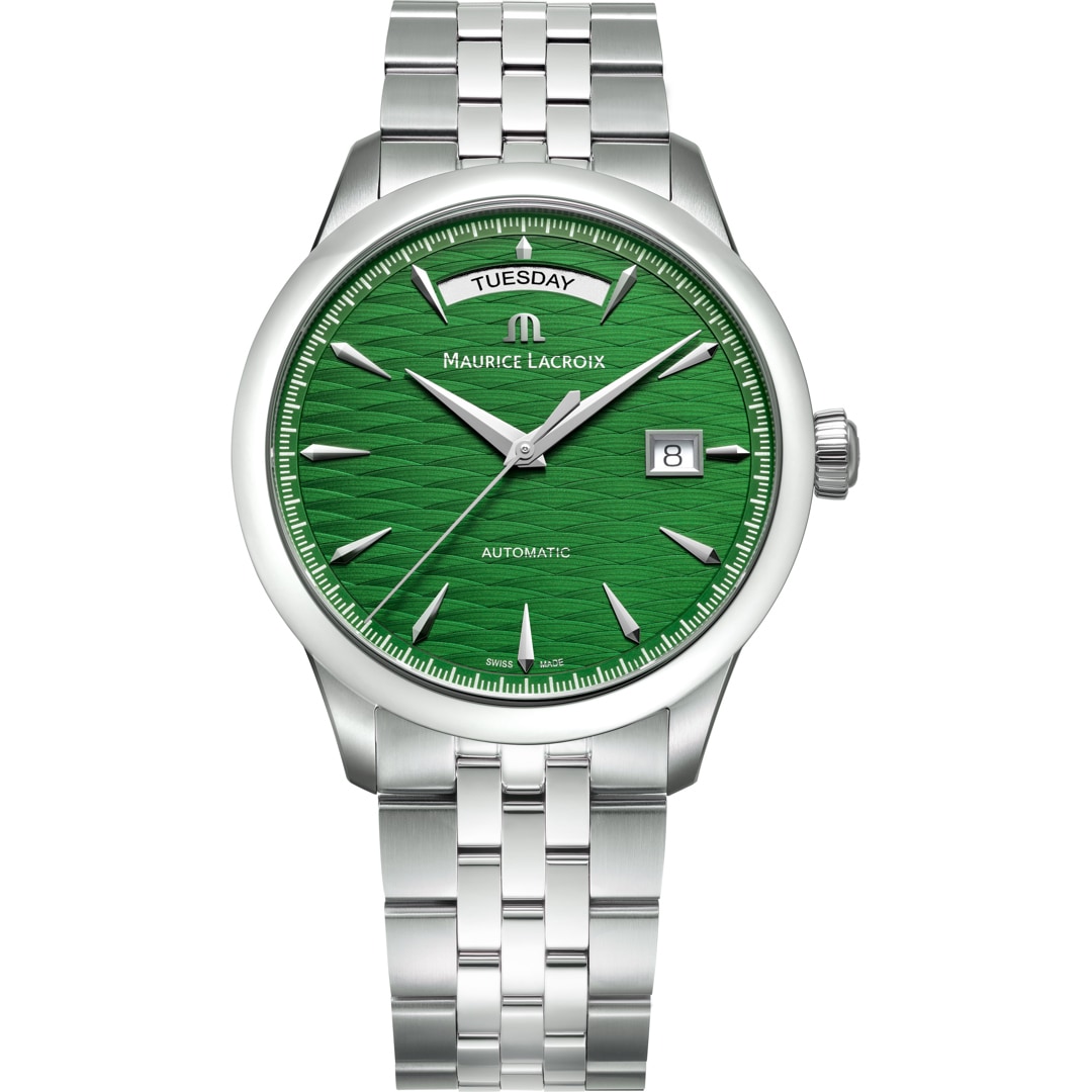 Als Hommage an 50 Jahre Uhrmacherkunst präsentiert Maurice Lacroix die 1975 Automatic Day Date Sapin Green, ein auf nur 500 Exemplare limitiertes Sammlerstück. Dieses Modell fängt die Seele der Heimat von Maurice Lacroix im Schweizer Jura ein. Das Zifferblatt erstrahlt in einem charakteristischen "Sapin Green", inspiriert von den Tannenwäldern rund um Saignelégier. Veredelt wird es durch das exklusive "Vagues du Jura"-Motiv, das die sanften Hügel der Region darstellt.