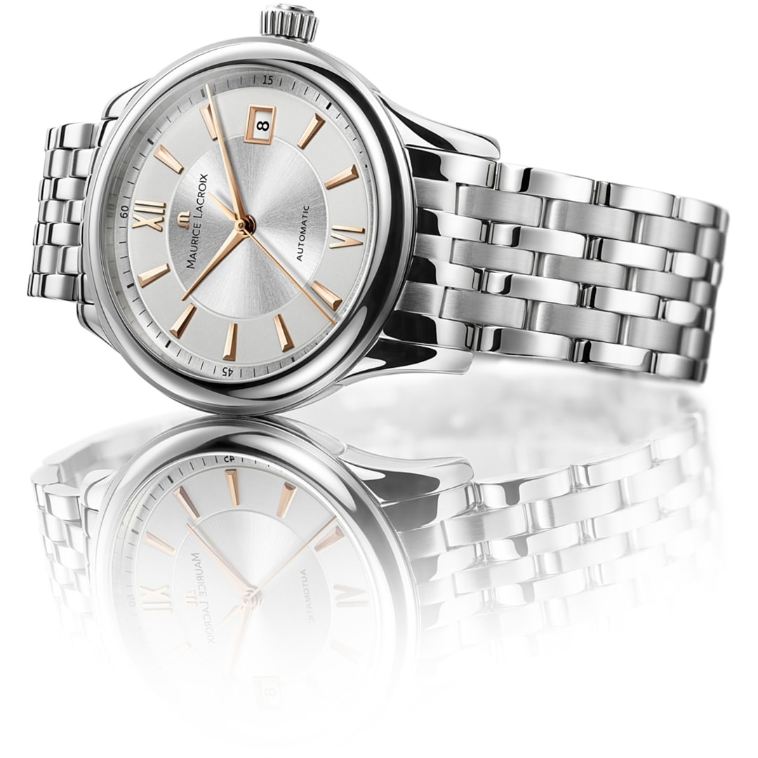Lässt sich einem schlichten Zifferblatt neues Leben einhauchen? Dieser Herausforderung hat sich Maurice Lacroix gestellt. Es ist den Designern der Marke gelungen, neue zeitlose Modelle von vollendet klassischer Ästhetik hervorzubringen. Die neuen Modelle stellen mit ihrer schlichten Eleganz eine vielfältige Ergänzung der Les Classiques Linie dar. Das Design der neuen Zeitmesser konzentriert sich auf eine klassische Ästhetik während die ursprüngliche Formsprache der Kollektion erhalten bleibt. So wurde die Lünette neu flach gestaltet, deren Aussenseite gewölbt und poliert ist. Die neuen Indizes des Zifferblattes sorgen für optimale Lesbarkeit. Sie sind in mehreren Farbtönen und vier neuen Designs erhältlich – römische oder arabische Ziffern, mit feinen oder ausgeprägten Applikationen. Das auf drei Uhr versetzte Datumsfenster wird durch eine aufgesetzte Umrandung ansprechend in Szene gesetzt. Zur Betonung der Kontraste von Materialien und Farben wurden für die Zifferblätter die Versionen Silber und Schwarzgold gewählt. Die Zifferblätter beeindrucken mit ausgeprägter Klarheit und gleichzeitig überraschender Tiefe. Schlichtheit in ihrer schönsten Form. Ausgestattet mit selbstaufziehenden Mechanikwerken sind diese Zeitmesser der perfekte Ausdruck des ästhetischen und technischen Könnens von Maurice Lacroix. Die neuen Modelle verleihen ihrem mechanischen Innern ein modernes, elegantes Aussehen, kombiniert mit einem zeitlosen Design. Durch die symmetrische und klare Gestaltung der Zifferblätter lenkt nichts von der Uhrzeit ab. Die Modelle Les Classiques kehren optisch zum Essentiellen zurück und stellen die Zeit in den Mittelpunkt. Die neuen Zeitmesser geben die Raffinesse und Authentizität der Marke stilsicher wider und sind der perfekte Begleiter für alle, die klassische Eleganz der Üppigkeit vorziehen.