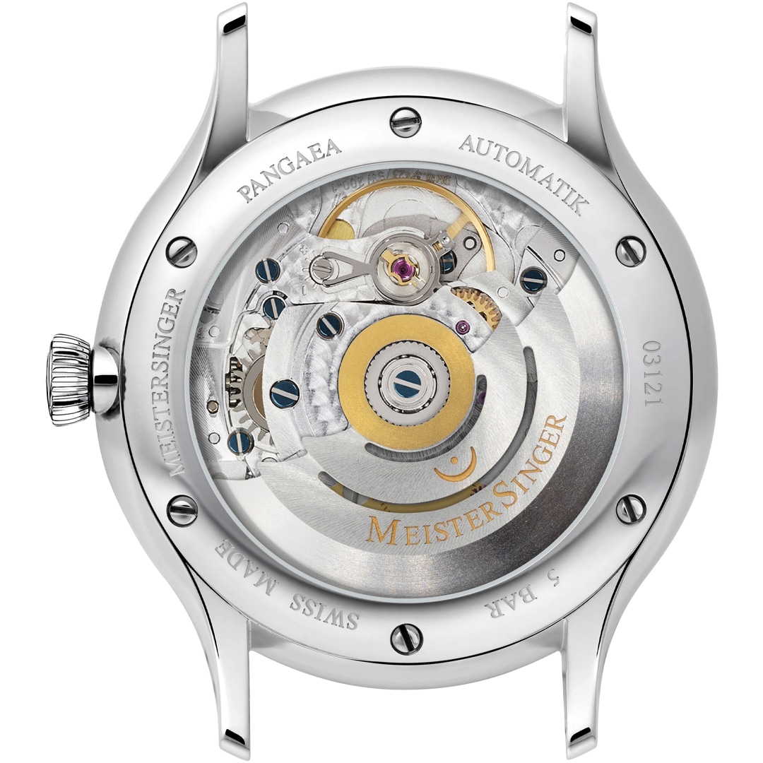 Im Inneren der Pangaea Day Date tickt das Schweizer Automatikwerk Sellita SW220, das speziell für die Einzeigeruhren von MeisterSinger modifiziert wird. Um Mitternacht ordnen sich die gegenläufigen Ringe blitzschnell zu einem neuen Tagesdatum an. Der Rotor versorgt das Automatikuhrwerk mit einer Gangreserve von 38 Stunden.