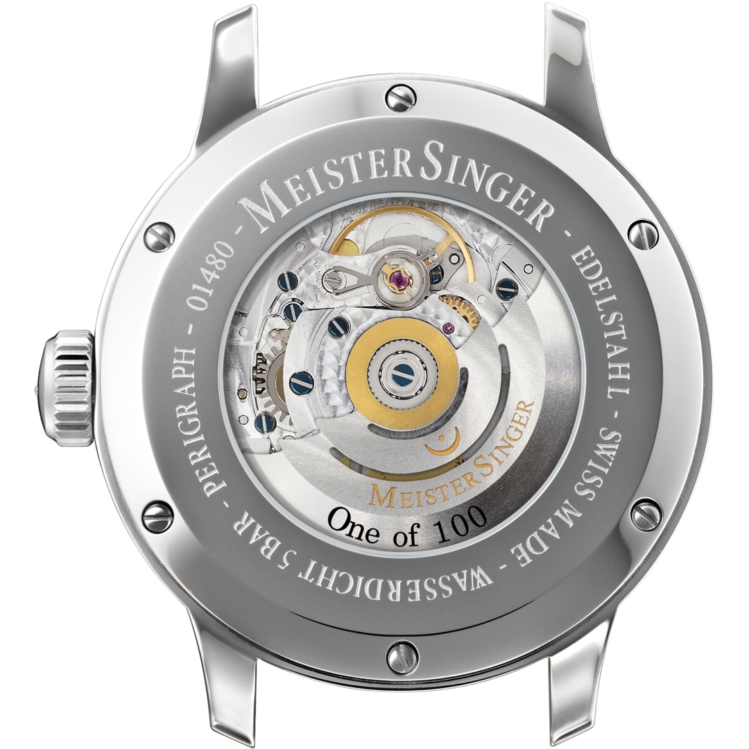 Im Inneren des Perigraph tickt das Schweizer Automatikwerk Sellita SW200, das speziell für die Einzeigeruhren von MeisterSinger modifiziert wird. Um Mitternacht schreitet das Datum blitzschnell einen Tag weiter. Der Rotor versorgt das Automatikuhrwerk mit einer Gangreserve von 38 Stunden.