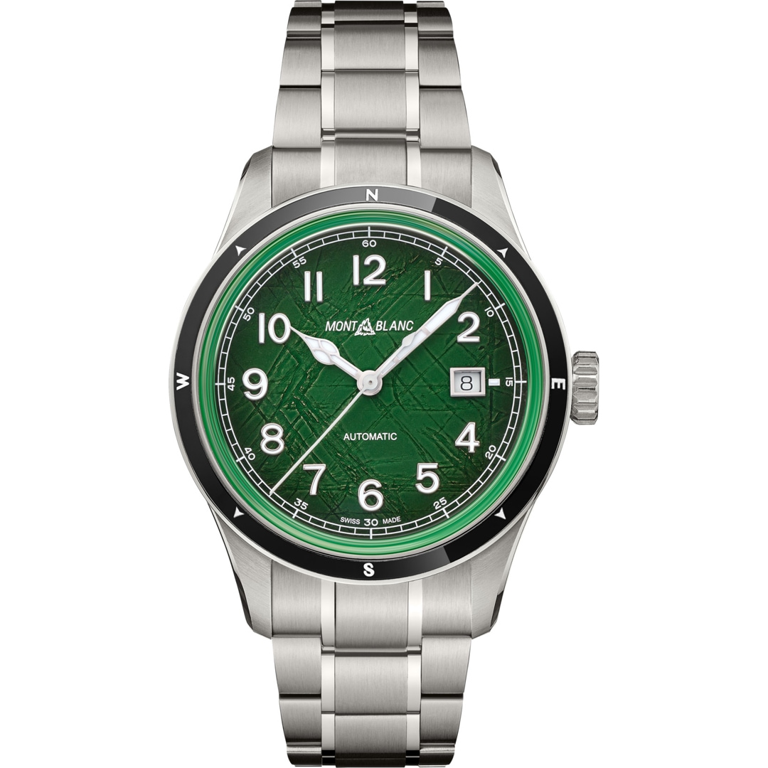 Das Zifferblatt mit dem Gletschermuster in Sfumato-Grün der Montblanc 1858 Automatic Date 0 Oxygen, das das Abenteuer Bergsteigen zum Ausdruck bringt, ist von der tiefgrünen Farbe des Jadebergs inspiriert. Die Uhr verfügt über ein 41-mm-Edelstahlgehäuse, das komplett sauerstofffrei ist. Es ist mit einer feststehenden schwarzen Keramiklünette versehen, auf der die vier Himmelsrichtungen mit Leuchtbeschichtung zu sehen sind. Ausgestattet mit einem schmal zulaufenden austauschbaren Edelstahlarmband mit Feineinstellung, verfügt die Uhr auf dem Gehäuseboden zudem über eine besondere „Spirit of Exploration“ Gravur.