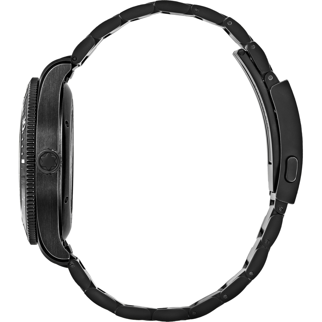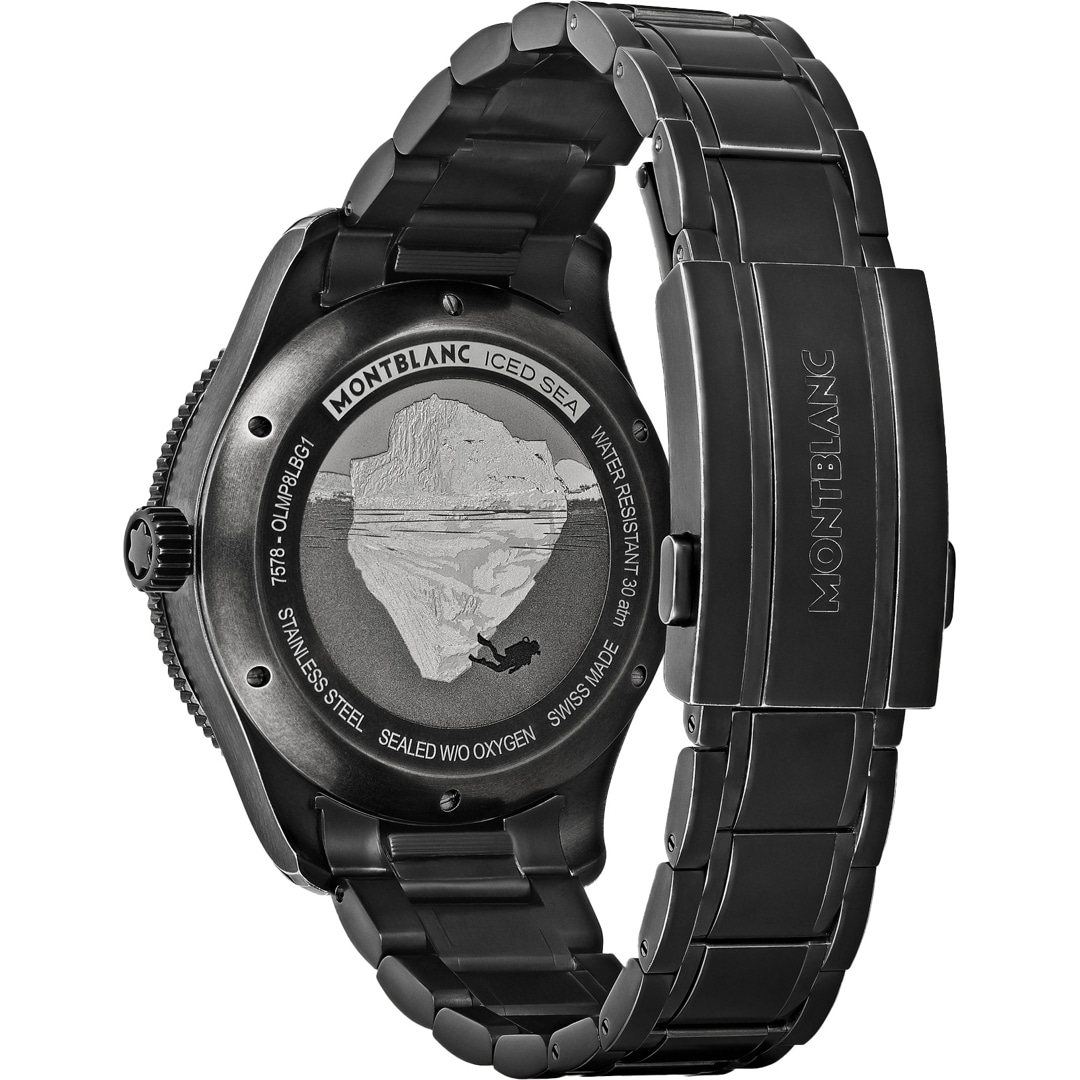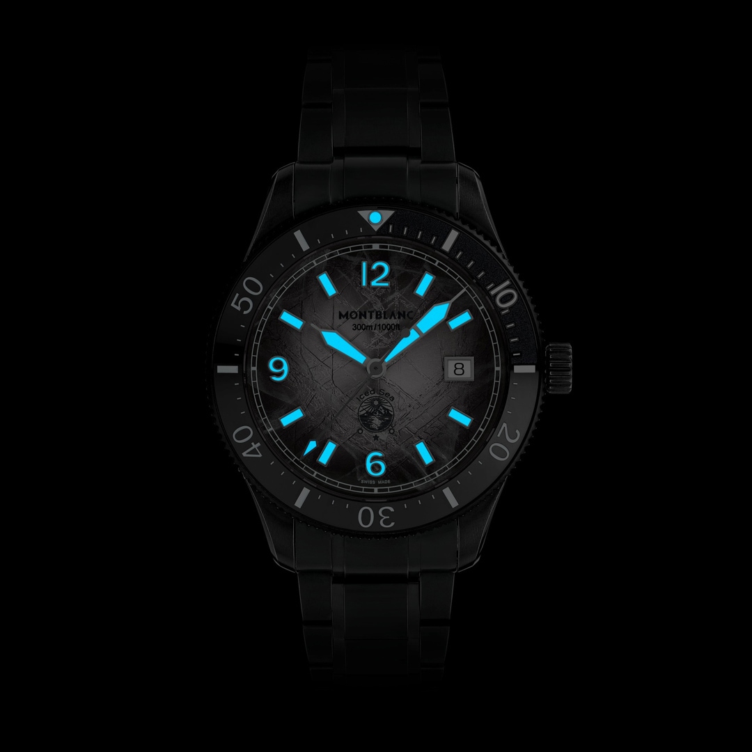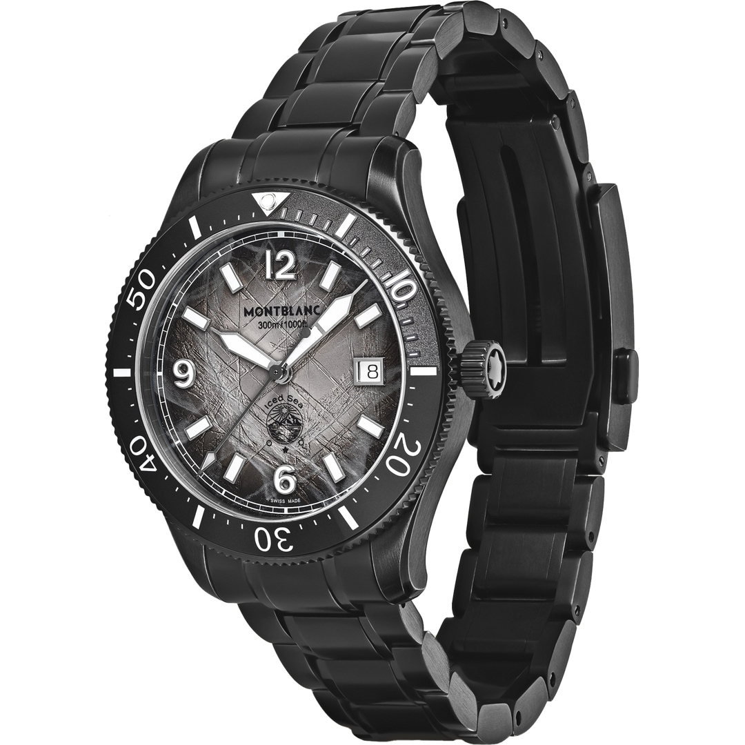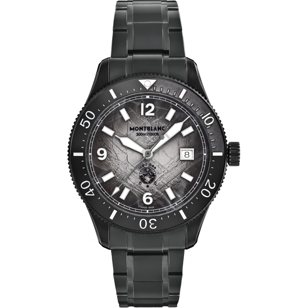 Die Montblanc Iced Sea Automatic Date 0 Oxygen mit grauem Zifferblatt mit Sfumato-Gletschermuster vermittelt den Eindruck, in die Tiefen eines Gletschers zu blicken. Inspiriert vom Mer de Glace wurde seine eisige Textur mithilfe einer nahezu in Vergessenheit geratenen Technik erhalten, dem „gratté-boisé“. Die Uhr ist in einem 41 mm grossen Gehäuse aus sauerstofffreiem Distressed-Stahl untergebracht und verfügt über eine einseitig drehbare Lünette mit schwarzem Keramikeinsatz, deren Markierung von 0 bis 15 Minuten per Laser vertieft ist, eine 3D-Gravur auf dem Gehäuseboden und ein austauschbares Armband aus Distressed-Stahl mit Feinverstellsystem. Die Uhr erfüllt die Anforderungen der ISO 6425 Norm für Gerätetauchen und ist wasserdicht bis 300 Meter.