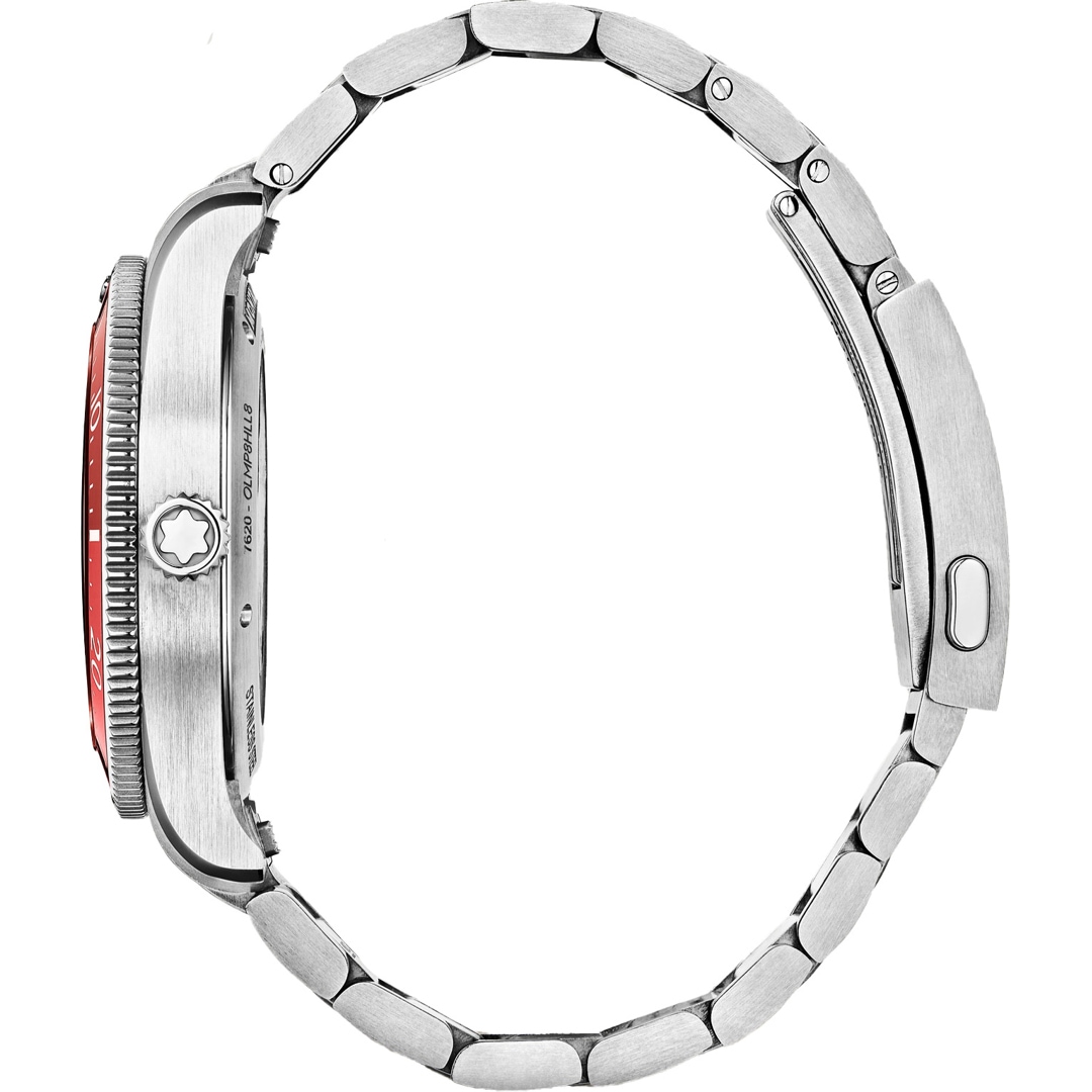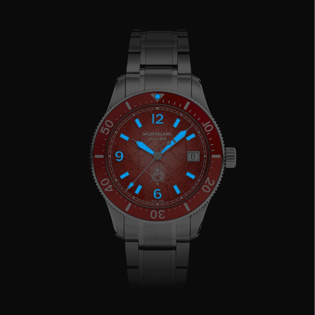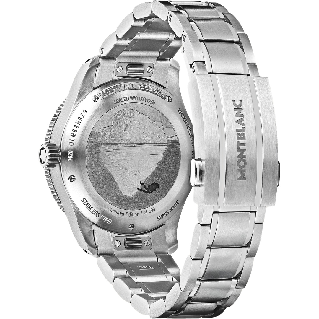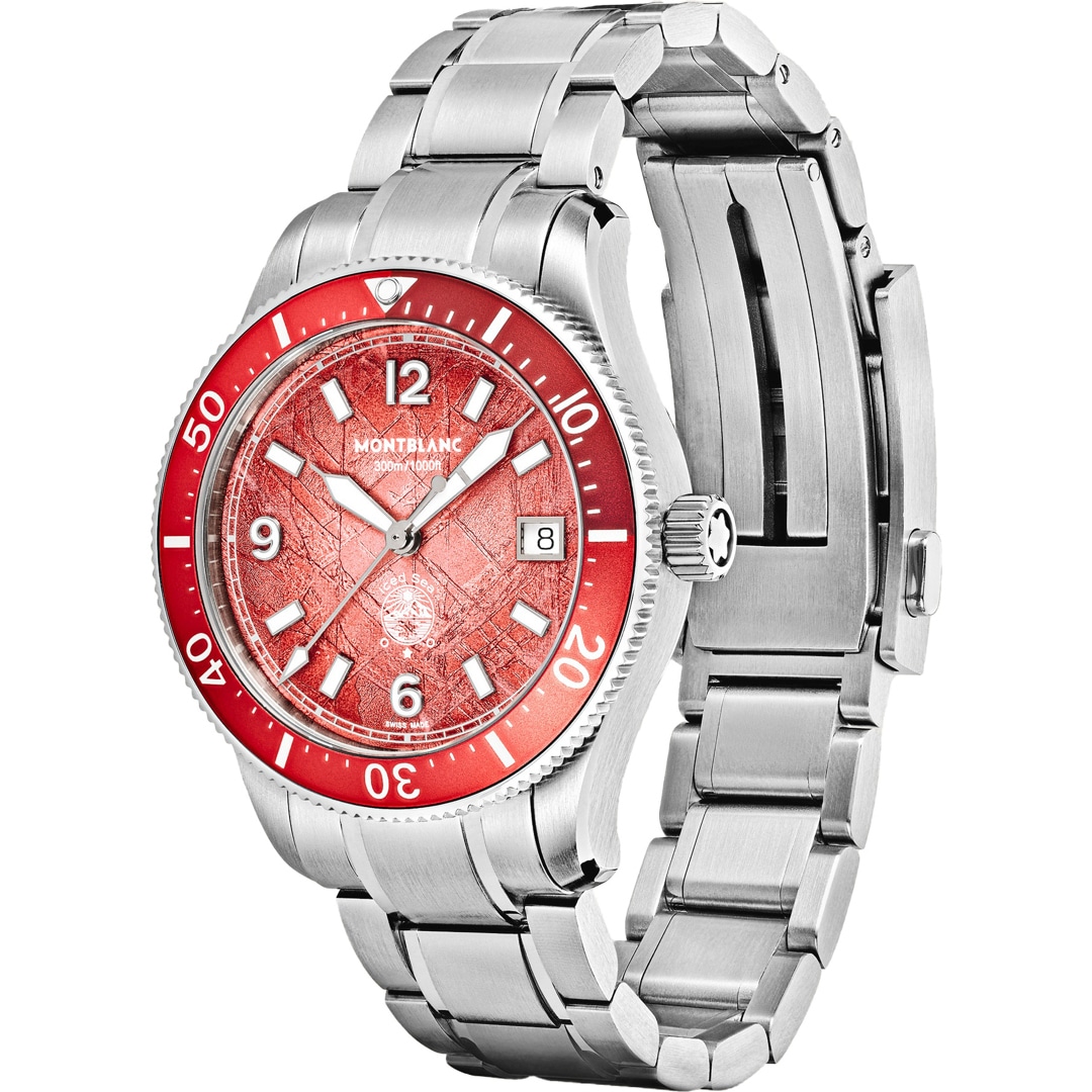 Die Montblanc Iced Sea Automatic Date 0 Oxygen Limited Edition mit korallenfarbenem Zifferblatt mit Sfumato-Gletschermuster vermittelt den Eindruck, in die Tiefen eines Gletschers zu blicken. Inspiriert vom Mer de Glace wurde seine eisige Textur mithilfe einer nahezu in Vergessenheit geratenen Technik erhalten, dem „gratté-boisé“. Die Uhr ist in einem 38 mm großen Edelstahlgehäuse untergebracht, das völlig sauerstofffrei ist, und verfügt über eine einseitig drehbare Lünette mit zweifarbigem Einsatz aus korallenfarbenem eloxiertem Aluminium und eine 3D-Gravur auf dem Gehäuseboden. Diese auf 300 Exemplare limitierte Edition wird mit einem austauschbaren und verstellbaren Edelstahlarmband sowie einem korallenfarbenen Kautschukarmband geliefert, die sich schnell und unkompliziert ohne Rückkehr in die Boutique oder den Einsatz von Werkzeug wechseln lassen Die Uhr erfüllt die Anforderungen der ISO 6425 Norm für Gerätetauchen und ist wasserdicht bis 300 Meter.