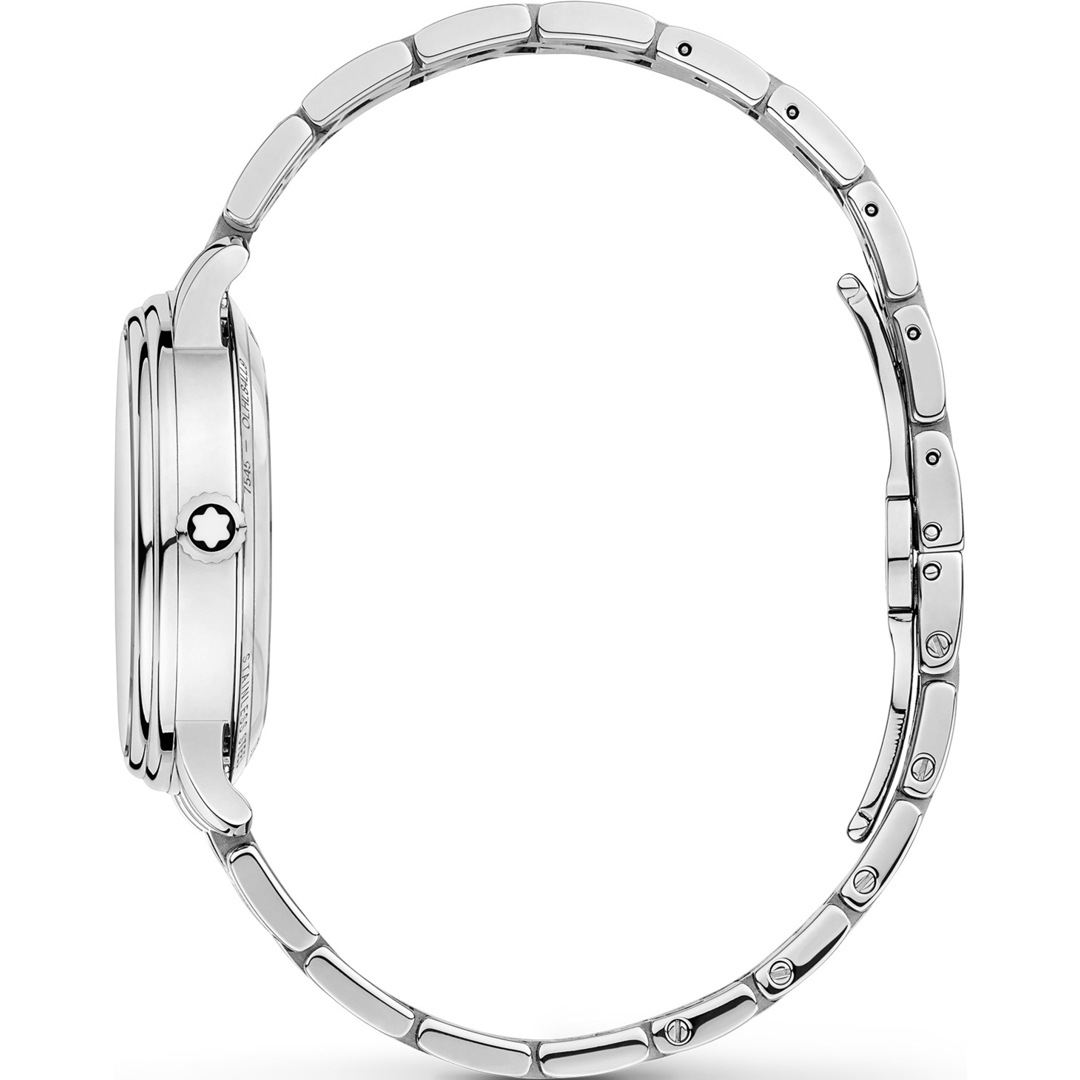 Die Montblanc Tradition Automatic Date verfügt über ein 32-mm-Edelstahlgehäuse, das mit geraden Hörnern und einer doppelt geformten Lünette versehen ist. Die Uhr besitzt ein blaues Zifferblatt mit Sonnenschliff und hervorstehenden rosévergoldeten römischen Ziffern und Diamantindizes. Die traditionelle Minuteneinteilung in Schienenoptik, die klassischen blattförmigen Stunden- und Minutenzeiger, der Sekundenzeiger und die Krone mit dem Montblanc Emblem sowie das Edelstahlarmband runden das moderne elegante Erscheinungsbild ab. Für eine praktische Nutzung im Alltag wird das Datum bei 3 Uhr angezeigt. Und das Saphirglas des Gehäusebodens gibt den Blick auf das Automatikwerk frei.