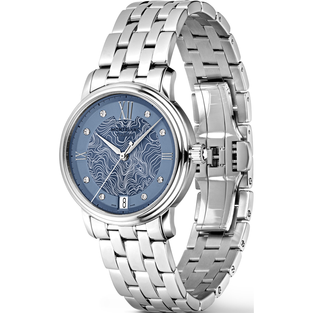 Die Montblanc Tradition Automatic Date verfügt über ein 32-mm-Edelstahlgehäuse, das mit geraden Hörnern und einer doppelt geformten Lünette versehen ist. Die Uhr ist mit einem blauen Zifferblatt ausgestattet, das die Topographie des Mont Blanc nachbildet und über Diamantindizes, silberfarbene römische Ziffern und eine hervorstehende römische Ziffer „XII“ verfügt. Die schwertförmigen Stunden- und Minutenzeiger, der Sekundenzeiger und die Krone mit dem Montblanc Emblem sowie das Edelstahlarmband runden das moderne elegante Erscheinungsbild ab.