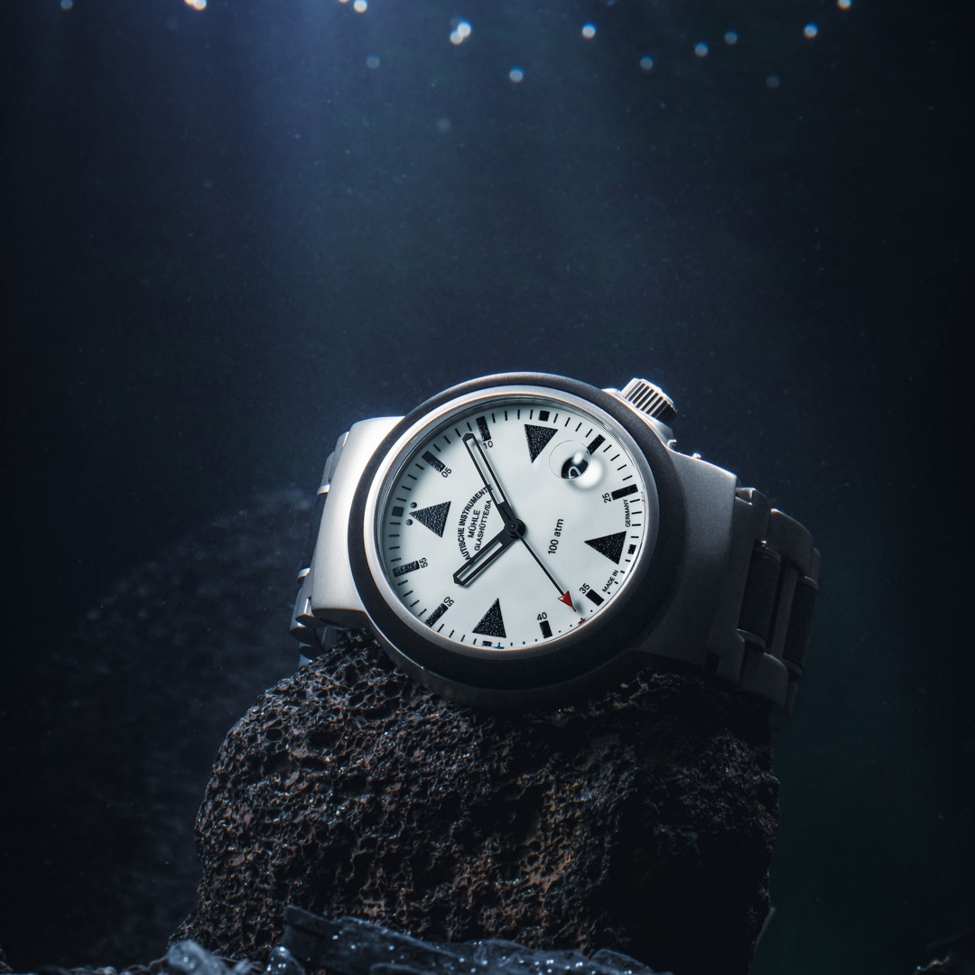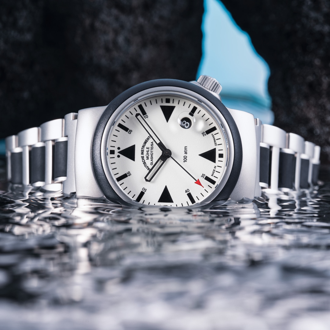 Machen Sie die tiefste Nacht zum helllichten Tag. Mit dieser leuchtenden Variante des berühmten S.A.R. Rescue Timer präsentiert Mühle Glashütte eine Einsatzuhr für wahrhaft extreme Bedingungen. Das absolute Highlight dieses Modells ist das vollständig mit Leuchtmasse beschichtete Zifferblatt. Darauf heben sich die schwarz lackierten und filigran skelettierten Zeiger bei Dunkelheit unübersehbar ab. So geniessen Sie rund um die Uhr eine unvergleichliche Orientierung. Darüber hinaus bietet dieser kompromisslose Zeitmesser die bewährte Robustheit der echten Seenotretter. Ein erstaunlich massives Saphirglas von vier Millimetern Dicke und die markante weiche Kautschuklünette trotzen spielend einem gewaltigen Wasserdruck von 100 Bar. Erleben Sie höchste mechanische Zuverlässigkeit gepaart mit maximaler Widerstandsfähigkeit dank der hauseigenen Spechthalsregulierung.
