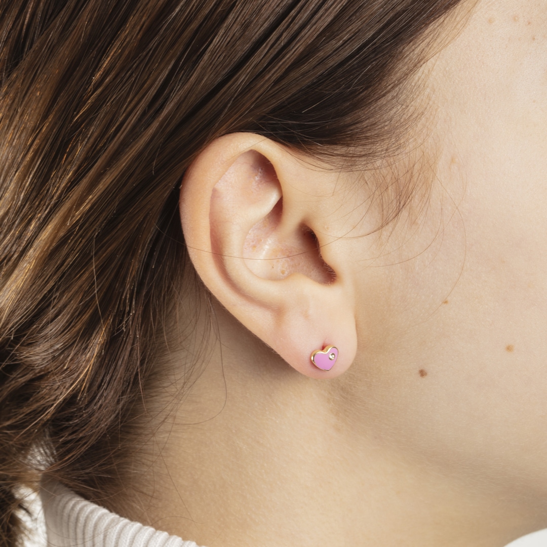 Diese hinreissenden Ohrstecker aus 750/18 K Gelbgold sind ein besonderer Hingucker: Die Oberfläche wurde mit Lack überzogen und der Glasstein setzt einen zusätzlichen Akzent. Dieses aufwändige Design, das hochwertige Material, die exzellente Verarbeitung und der angenehme Tragekomfort machen diese Herz-Ohrstecker zu einem Lieblingsstück für Klein und Gross.