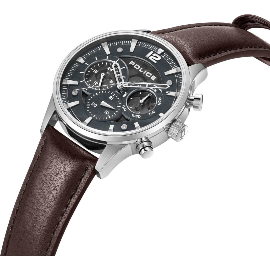 Mit der neuesten Multifunktionsuhr überschreitet Police einmal mehr die Grenzen von Stil und Funktion. Die Driver II - ein ungefilterter Ausdruck schlanker Funktionalität - verkörpert das kühne stilistische Ethos der Marke. Jedes Detail, von den Unteraugen bis hin zu den Schrauben, wurde mit Bedacht platziert, um Präzision und Schärfe zu gewährleisten. Das halbtransparente Zifferblatt zeigt die komplexe Mechanik des Multifunktionswerks und verleiht diesem minimalistischen Meisterwerk einen Hauch von Faszination.
