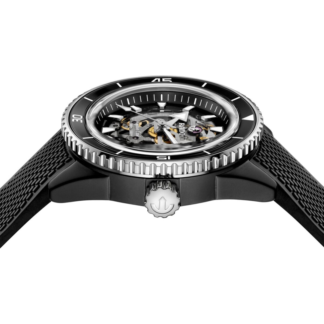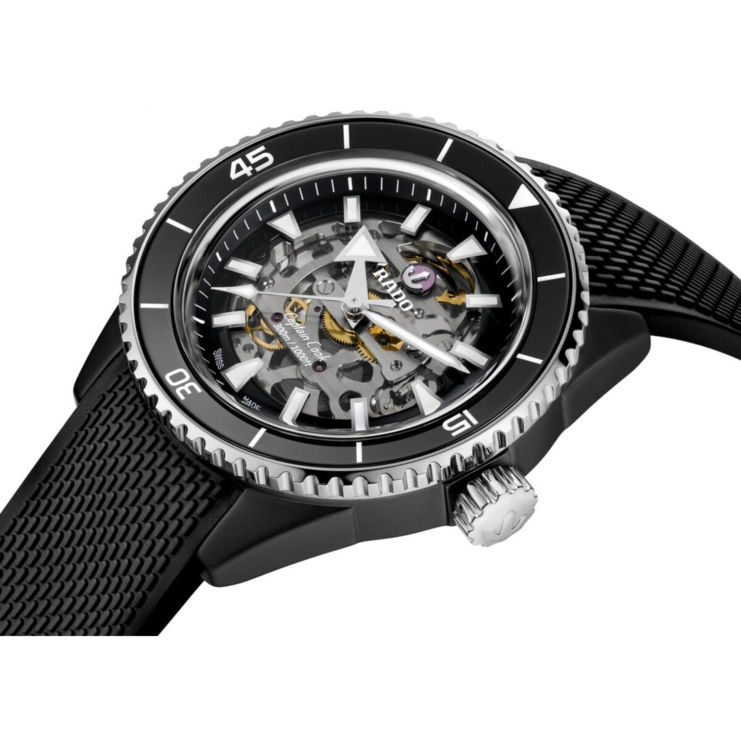 Die Rado Captain Cook High-Tech Ceramic Skeleton rückt ihr innovatives R808 Uhrwerk ins Zentrum – ein Zusammenspiel von Know-how, Präzision und intelligenter Geometrie, das den Blick auf die feinen Bauteile freigibt. Ausgestattet mit einer antimagnetischen Nivachron™ Spiralfeder, umfassend getestet in fünf Lagen, bietet sie eine Gangreserve von bis zu 80 Stunden. Das Gehäuse aus Hightech-Keramik überzeugt in Monoblock-Bauweise, ergänzt durch eine drehbare Lünette. Das klare Zifferblatt mit grosszügigen Indizes und Zeigern mit Super-LumiNova® sorgt für optimale Ablesbarkeit. Abgerundet wird die sportliche Ausstrahlung durch ein passendes Kautschukarmband mit Keramikschliesse.