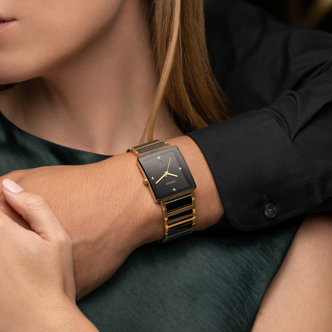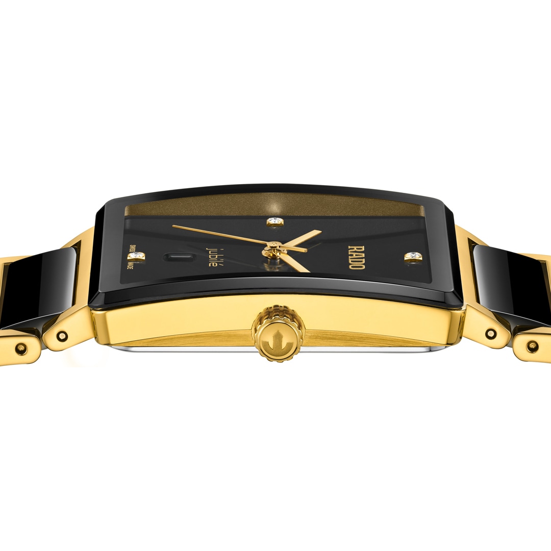 Ihre Vorliebe für die schönen Dinge des Lebens ist nicht zu übersehen. Sie lieben Komfort, exquisites Design und die Wärme von Gelbgold. Ihre Entscheidung für die Rado Integral spricht für sich. Das ikonische rechteckige Gehäuse aus Edelstahl mit poliertem gelbgoldfarbenen Finish wird von einem randlosen, facettierten Saphirglas mit Antireflexionsbeschichtung und schwarzer Metallisierung vollendet. Gelbgoldfarbene Zeiger gleiten über das schwarz lackierte Zifferblatt und 4 hochkarätige Diamanten. Das Rado Uhrwerk R218 mit 8 Steinen garantiert eine Präzision, die dem Schweizer Standard für zertifizierte Chronometer entspricht – für eine hervorragende Zeitmessung. Die Rado Integral vereint den aussergewöhnlichen Tragekomfort schwarzer Hightech-Keramik-Mittelglieder im sanft verjüngten Armband mit der edlen Präsenz eines prächtigen Saphirglases. Das Tüpfelchen auf dem i: Das gewölbte Glas schmiegt sich harmonisch an die Kontur Ihres Handgelenks – ein unverkennbares Statement für Ihren ausgeprägten Sinn für eleganten Stil.
