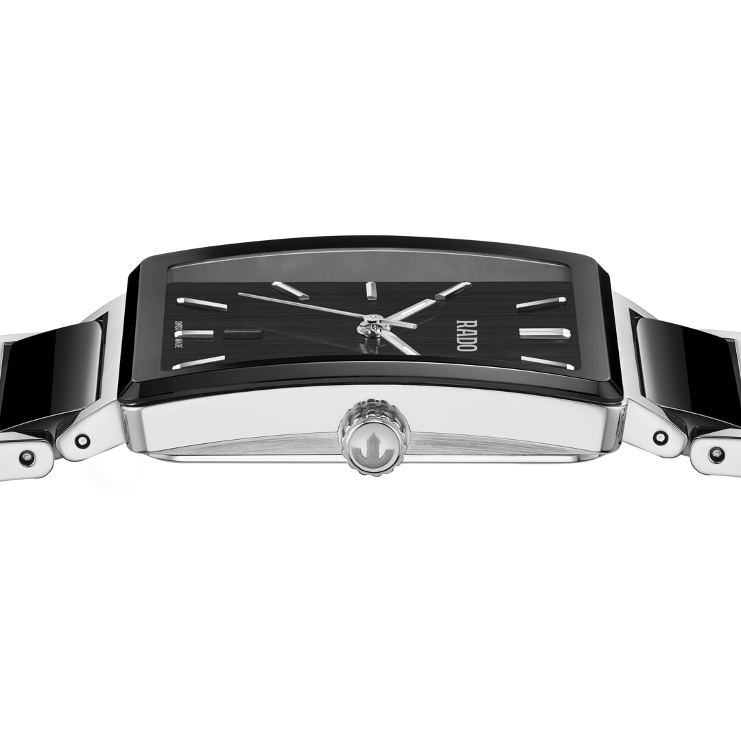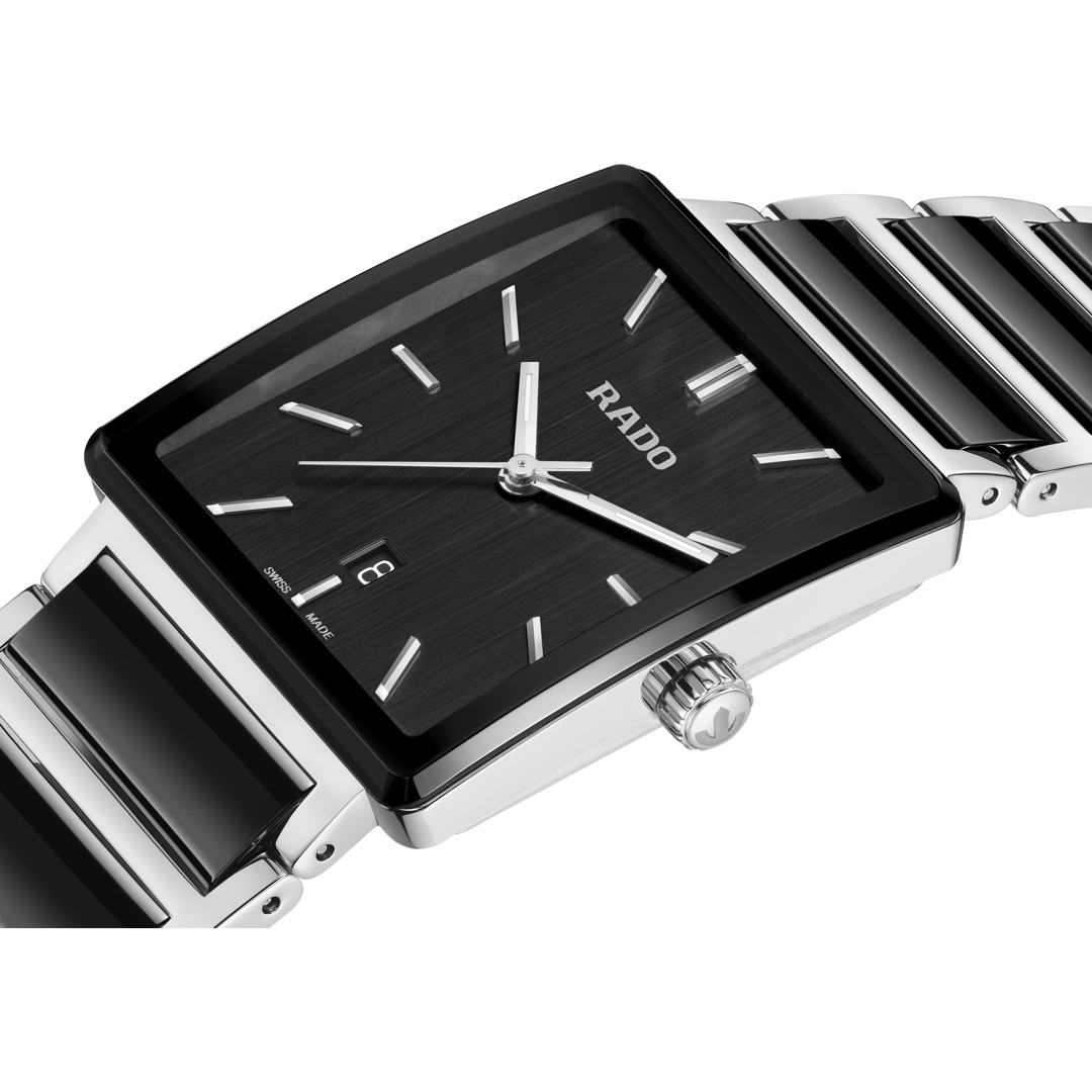 Ihr Stilgefühl spricht Bände: eine unendliche Geschichte der Raffinesse. Mit der Rado Integral geniessen Sie exquisiten Komfort und zeitlose Eleganz. Das charakteristische rechteckige Gehäuse aus Edelstahl wird von einem gewölbten Saphirglas mit Antireflexionsbeschichtung und schwarzer Metallisierung vollendet. Rhodinierte, applizierte Indizes mit weissem Super-LumiNova® sind die perfekte Ergänzung zu einem schwarzen, vertikal gebürsteten Finish und dem versilberten Rado Logo. Rhodinierte Stunden- und Minutenzeiger mit weissem SuperLumiNova® und ein rhodinierter Sekundenzeiger sorgen zudem für eine gute Ablesbarkeit rund um die Uhr. Unter der luxuriösen Oberfläche verbirgt sich das präzise Quarzwerk Rado R218. Die neue Integral verfügt über ein leicht verjüngtes Armband aus Edelstahl mit Mittelgliedern aus Hightech-Keramik, das perfekt zu den eleganten Proportionen des ikonischen rechteckigen Gehäuses passt. Das gewölbte Glas schmiegt sich harmonisch an die Kontur Ihres Handgelenks – ein unverkennbares Statement für Ihren ausgeprägten Sinn für zeitlosen Stil. Mit der schlanken, eleganten Rado Integral wählen Sie eine Uhr fürs Leben.