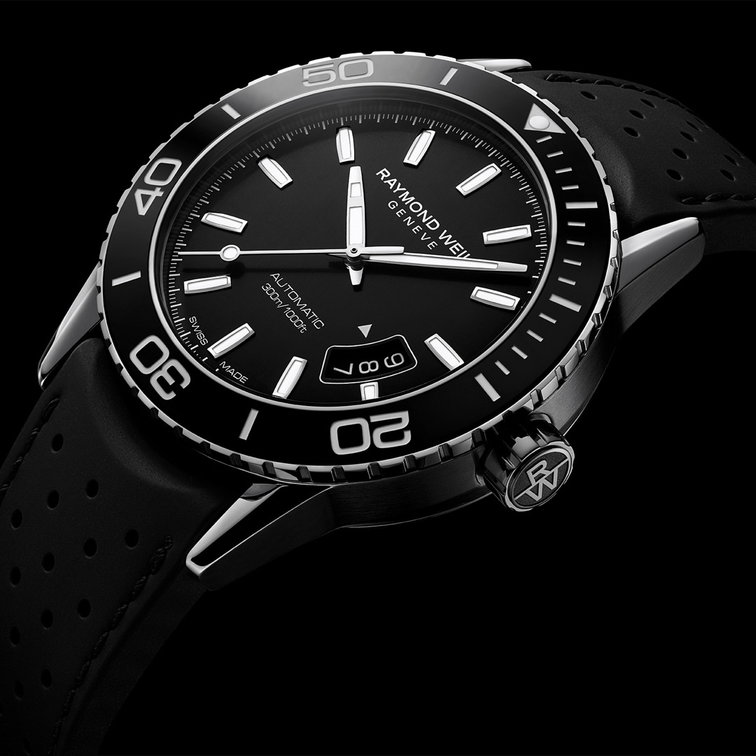 Die nicht nur leistungsstarke, sondern auch elegante Freelancer für Herren Taucheruhr hat ein 42-mm-Gehäuse aus poliertem Edelstahl und ein schwarzes Gummiarmband. In Form und Funktion erinnert sie an eine traditionelle Taucheruhr. Das Design wird durch die unidirektionale Drehlünette aus schwarzer Keramik mit weißer Graduierung und Leuchtindizes sowie eine verschraubte Krone mit dem charakteristischen RW-Monogramm vollendet.