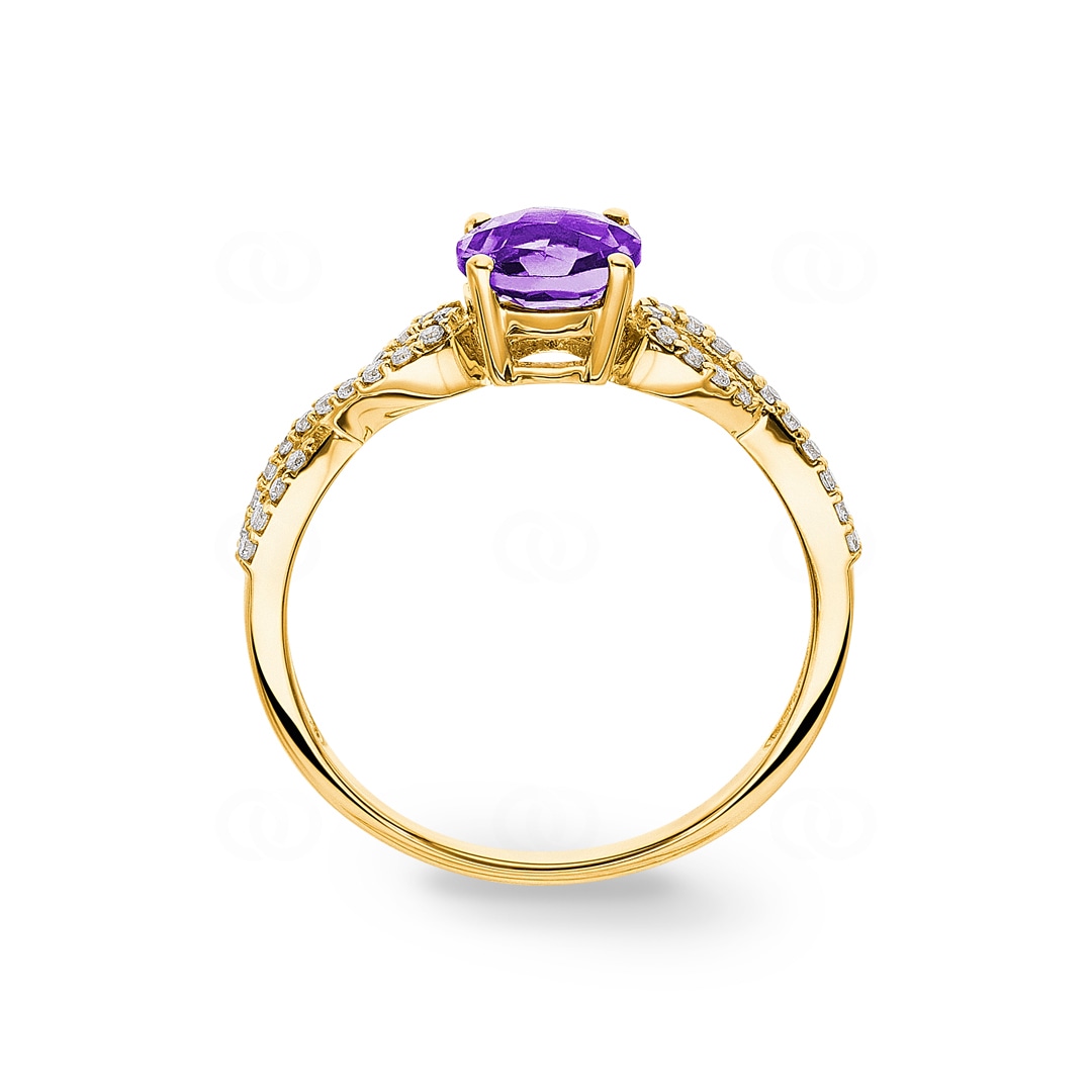 Dieser kunstvoll gefertigte Damenring aus 18 Karat Gelbgold ist ein Meisterwerk der Juwelierskunst. Im Zentrum thront ein grosser, runder Amethyst in einer eleganten 4-Griff Fassung, der mit seinem faszinierenden violetten Glanz alle Blicke auf sich zieht. Die geschwungene Ringschiene, besetzt mit insgesamt 38 entzückenden Diamanten, verleiht dem Ring eine unvergleichliche Brillanz und sorgt für funkelnde Akzente. Dieses edle Schmuckstück ist ein Ausdruck zeitloser Schönheit und Eleganz, ideal für besondere Anlässe oder als kostbares Geschenk, das seine Trägerin mit Anmut und Glanz umgibt.