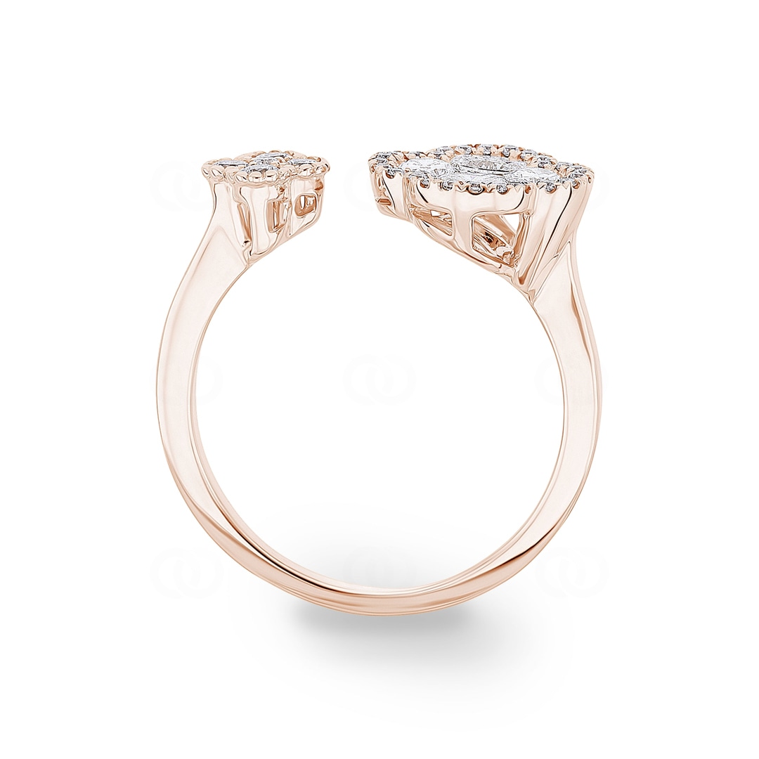 Dieser offene Ring aus 18 Karat Gold ist ein wahres Feuerwerk der Diamantkunst und interpretiert den klassischen Toi et Moi-Stil völlig neu. Zwei florale Motive begegnen sich auf der Ringschiene, doch das wahre Geheimnis liegt im Detail der grösseren Blüte. Hier formen 4 Diamanten im Ovalschliff und ein zentraler Princess-Diamant ein kunstvolles Mosaik, das die Optik eines einzelnen, riesigen Edelsteins simuliert. Umrahmt von einem Kranz aus Brillanten, entsteht eine atemberaubende Tiefenwirkung. Zusammen mit dem kleineren, vollständig mit Brillanten ausgefassten Kleeblatt vereint dieses Schmuckstück insgesamt 38 Diamanten zu einem harmonischen Ganzen. Ein Ring für Frauen, die das Aussergewöhnliche suchen und technische Raffinesse zu schätzen wissen.