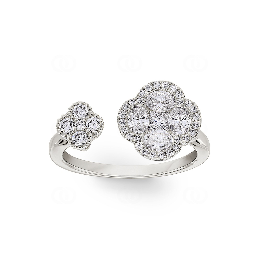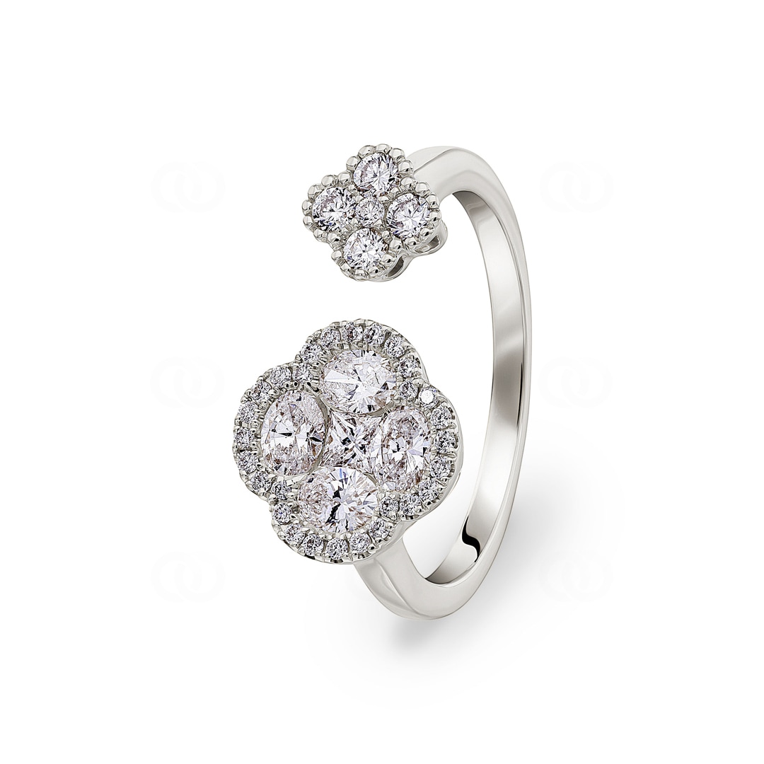 Dieser offene Ring aus 18 Karat Gold ist ein wahres Feuerwerk der Diamantkunst und interpretiert den klassischen Toi et Moi-Stil völlig neu. Zwei florale Motive begegnen sich auf der Ringschiene, doch das wahre Geheimnis liegt im Detail der grösseren Blüte. Hier formen 4 Diamanten im Ovalschliff und ein zentraler Princess-Diamant ein kunstvolles Mosaik, das die Optik eines einzelnen, riesigen Edelsteins simuliert. Umrahmt von einem Kranz aus Brillanten, entsteht eine atemberaubende Tiefenwirkung. Zusammen mit dem kleineren, vollständig mit Brillanten ausgefassten Kleeblatt vereint dieses Schmuckstück insgesamt 38 Diamanten zu einem harmonischen Ganzen. Ein Ring für Frauen, die das Aussergewöhnliche suchen und technische Raffinesse zu schätzen wissen.