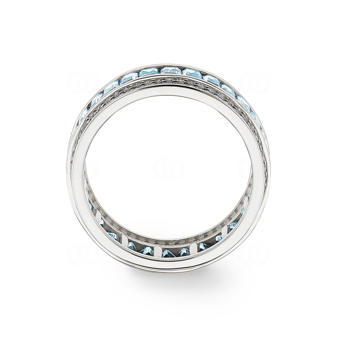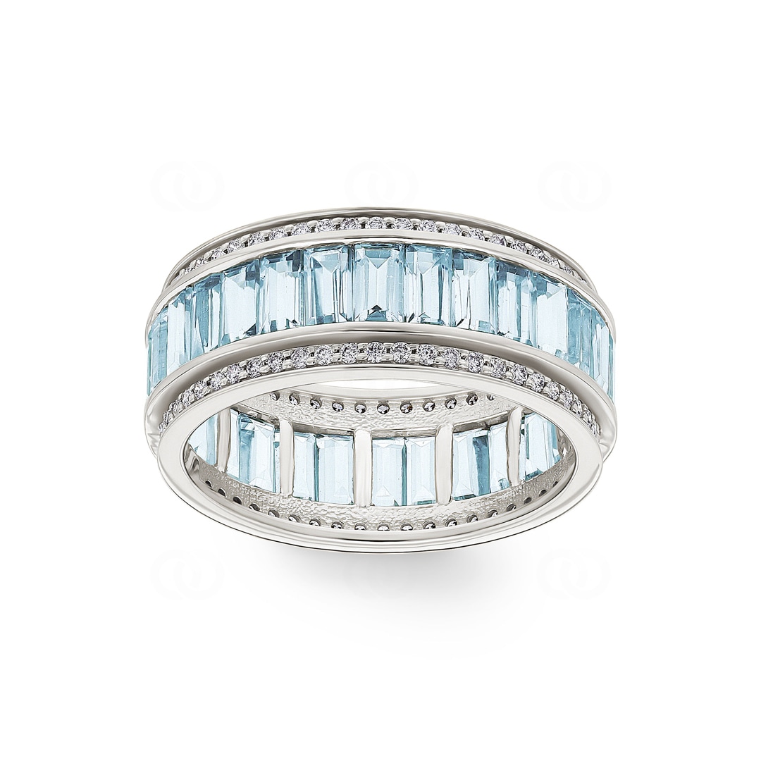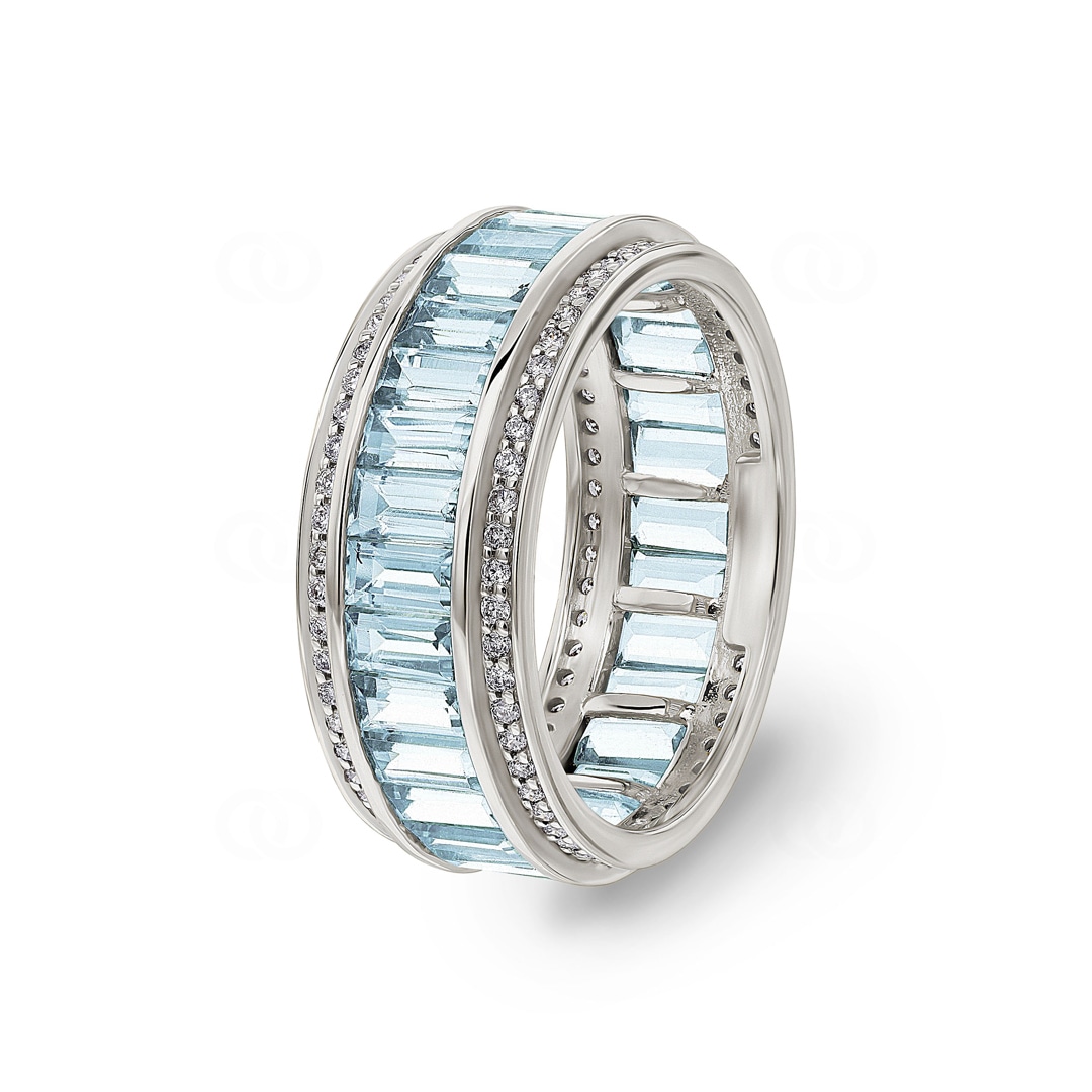 Dieser Ring aus 18 Karat Weissgold ist ein faszinierendes Zusammenspiel von geometrischer Klarheit und sanfter Farbe, entworfen für einen unvergesslichen, edlen Auftritt. Im Mittelpunkt steht eine durchgehende Reihe von 30 Aquamarinen im eleganten Baguetteschliff. Ihr klares, eisblaues Leuchten erinnert an die ruhige See und verleiht dem Ring eine frische, luxuriöse Ausstrahlung. Eingerahmt wird diese eisblaue Linie von jeweils einer Reihe funkelnder Diamanten auf beiden Seiten. Die insgesamt 108 Diamanten ergänzen die Aquamarine zu einem harmonischen Gesamtbild aus reinem Licht.