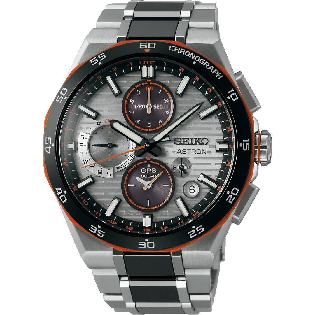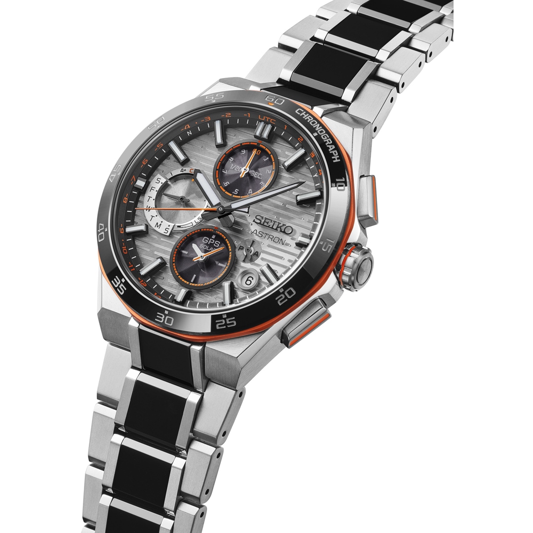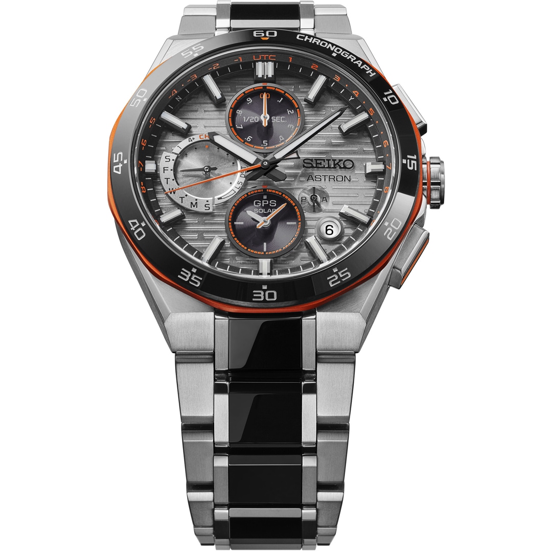 Die Seiko Astron GPS Solar 2025 Limited Edition ist ein Bekenntnis zu maximaler Präzision und kühnem Design. Ihr kantiges Gehäuse aus leichtem Titan bildet eine perfekte Symbiose mit den tiefschwarzen Gliedern aus polierter Keramik im Armband. Elektrisierende Akzente in Neonorange an der polygonalen Lünette und auf dem Zifferblatt schaffen einen unverkennbaren, sportlich-technischen Look, der sofort ins Auge fällt.