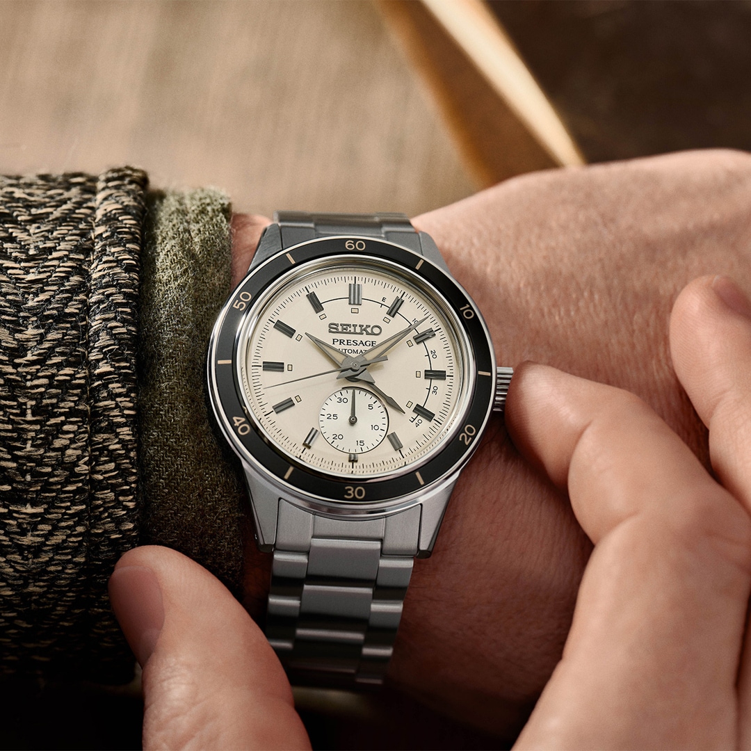Seiko Presage begrüsst eine neue Serie, die „Style 60's“, in seiner Kollektion. Sie kombiniert das Vintage-Gefühl eines Meilensteins der Seiko Uhrengeschichte mit der traditionellen Uhrmacherkunst, für die die Presage Kollektion bekannt ist. Das Design der neuen Seiko Presage „Style 60's" Serie ist inspiriert von dem 1964 eingeführten Crown Chronographen. Mit ihren Erdtönen kombinieren die Uhren das Design des Originals mit zeitgenössischen Elementen, um so eine Serie mit einem Vintage-Look zu schaffen, die perfekt in die moderne Zeit passt.