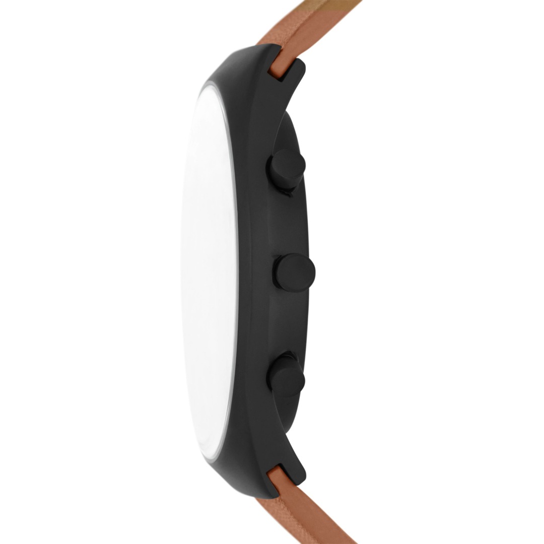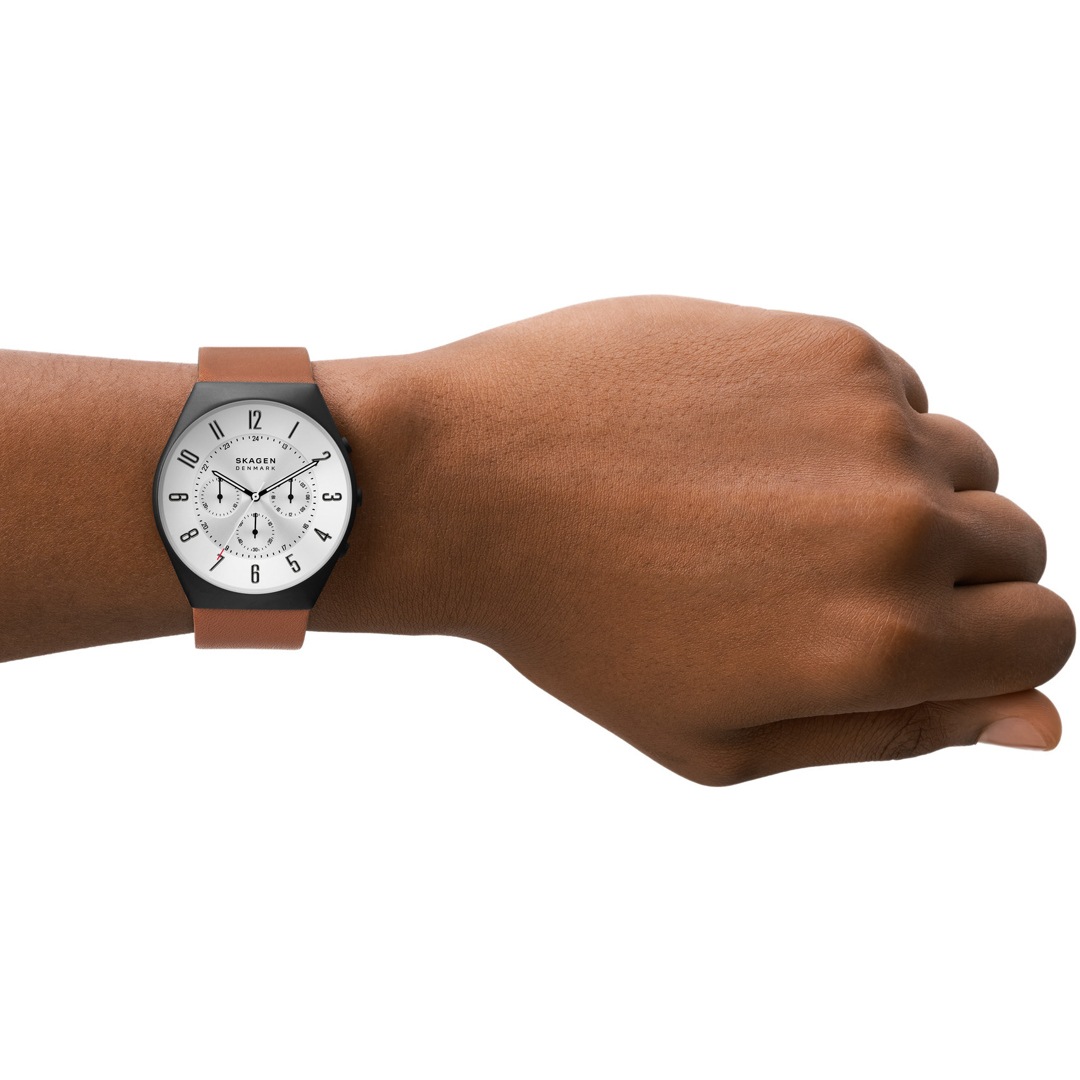 Funktionell und minimalistisch in der Form - Die Silhouette der Herrenuhr Grenen erinnert an die Küstenlinie des Grenen Strandes bei Skagen, Dänemark. Die Herrenuhr mit 42-mm-Gehäuse aus mindestens 50 % recyceltem Edelstahl hat ein Chronographenwerk und ein weiss-silberfarbenes Sunray-Zifferblatt. Dazu gehört ein mittelbraunes Lederband aus einer von der LWG zertifizierten Gerberei.