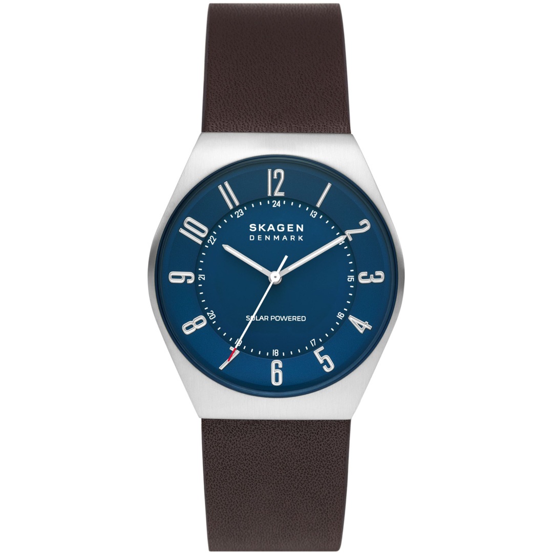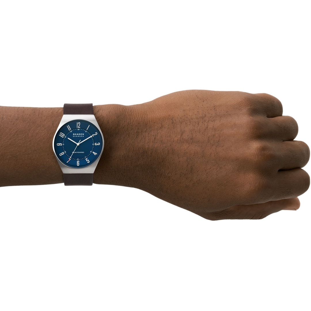 Funktionell und minimalistisch in der Form - Die Silhouette der Herrenuhr Grenen Solar erinnert an die Küstenlinie des Grenen Strandes bei Skagen, Dänemark. Die 3-Zeiger Herrenuhr mit silbrigem 37mm-Gehäuse aus mindestens 50 % recyceltem Edelstahl hat ein mattes tiefblaues Zifferblatt. Dazu gehört ein dunkelbraunes Lederarmband.
