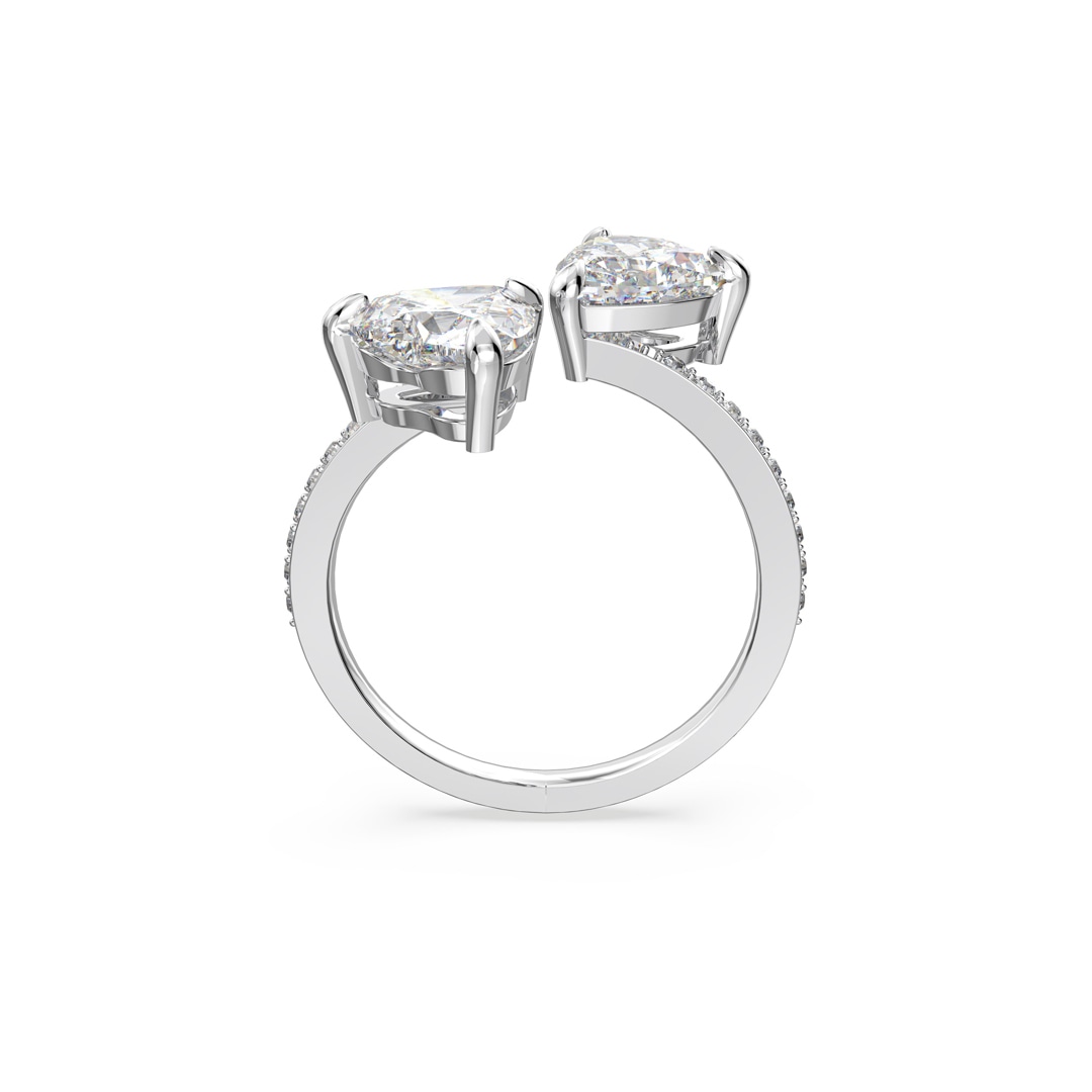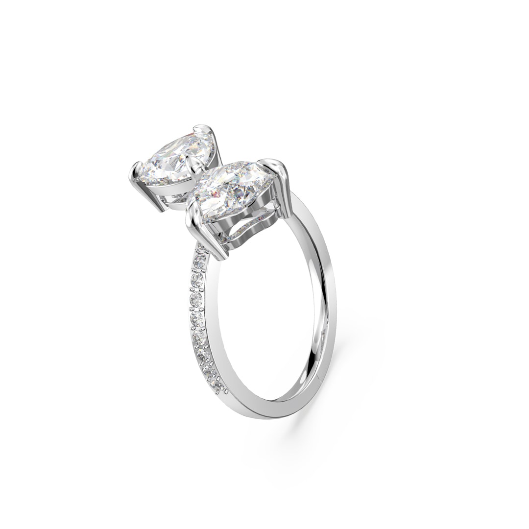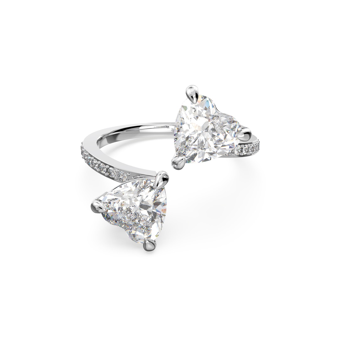 Dieser rhodinierte Ring von Swarovski lässt unverzüglich an zwei Herzen denken, die zueinander finden. In einer besonders romantischen Geste treffen sich zwei präzise geschliffene Herzelemente vorn am Finger. Die schlichte Eleganz des Designs unterstreicht das faszinierende Funkeln der weissen Herzen. Das ist ewig währende Symbolkraft und damit die perfekte Geschenkidee für die Liebe Ihres Lebens.