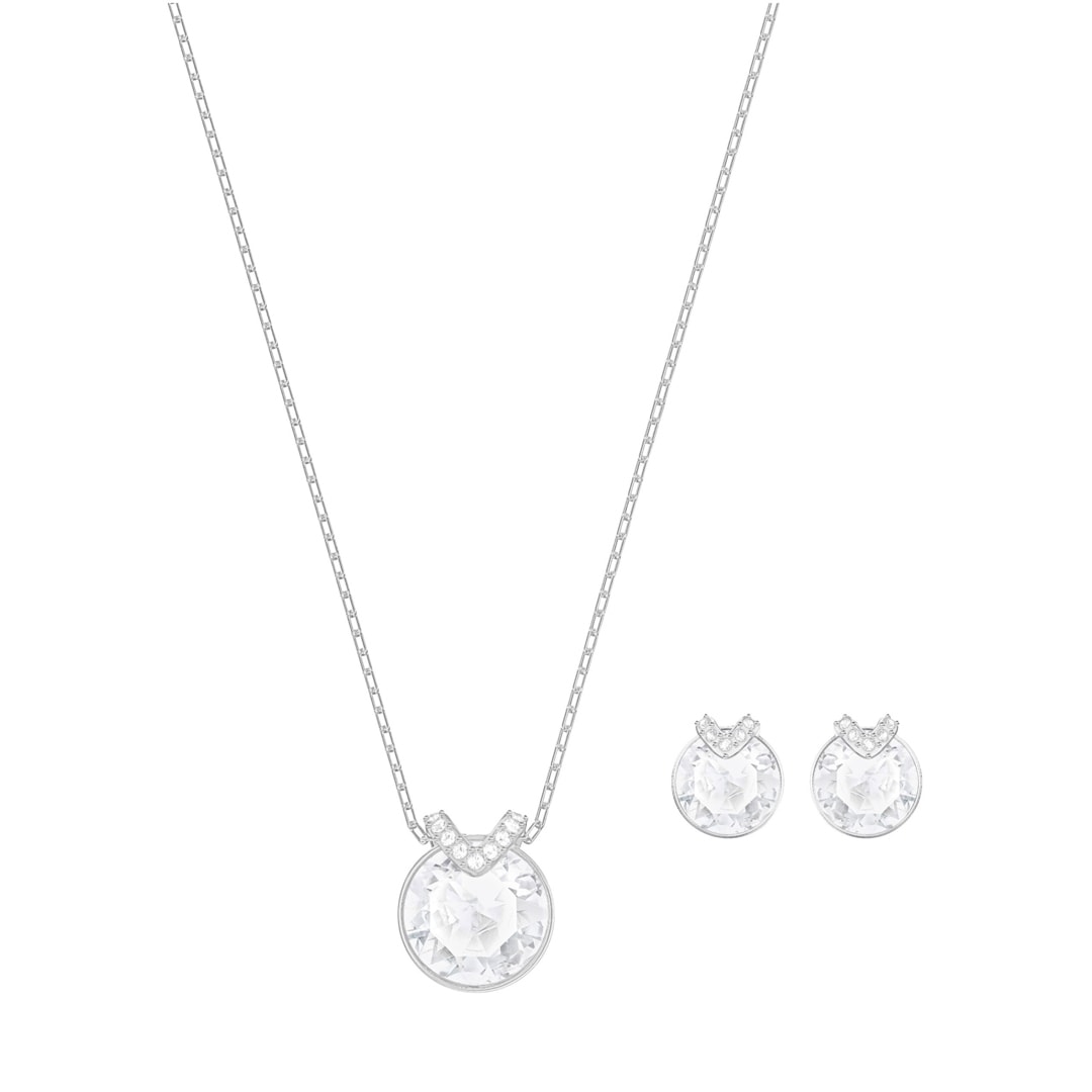 Die schlichte Eleganz dieses femininen Sets lässt dich in dieser Saison und weit darüber hinaus stilvoll glänzen. Dazu gehören ein rhodinierter Anhänger an einer Kette und die dazu passenden Ohrstecker. Die faszinierenden, klaren Rundkristalle mit filigranen Akzenten in klarem Kristallpavé sind zeitlos schöne Begleiter für jedes Outfit. So macht das Umstylen vom Büro zur Dinner-Einladung noch mehr Spass!
