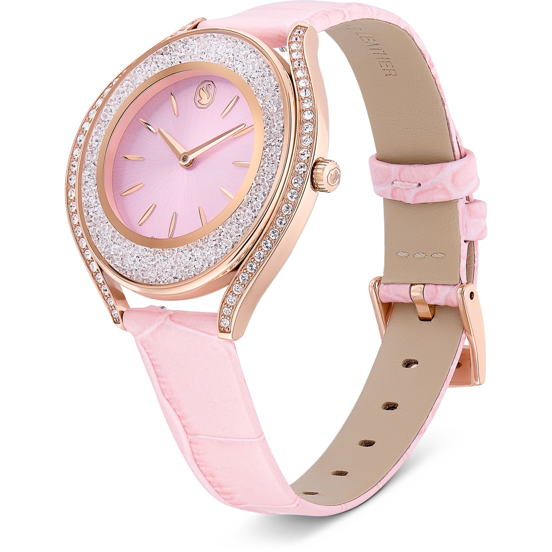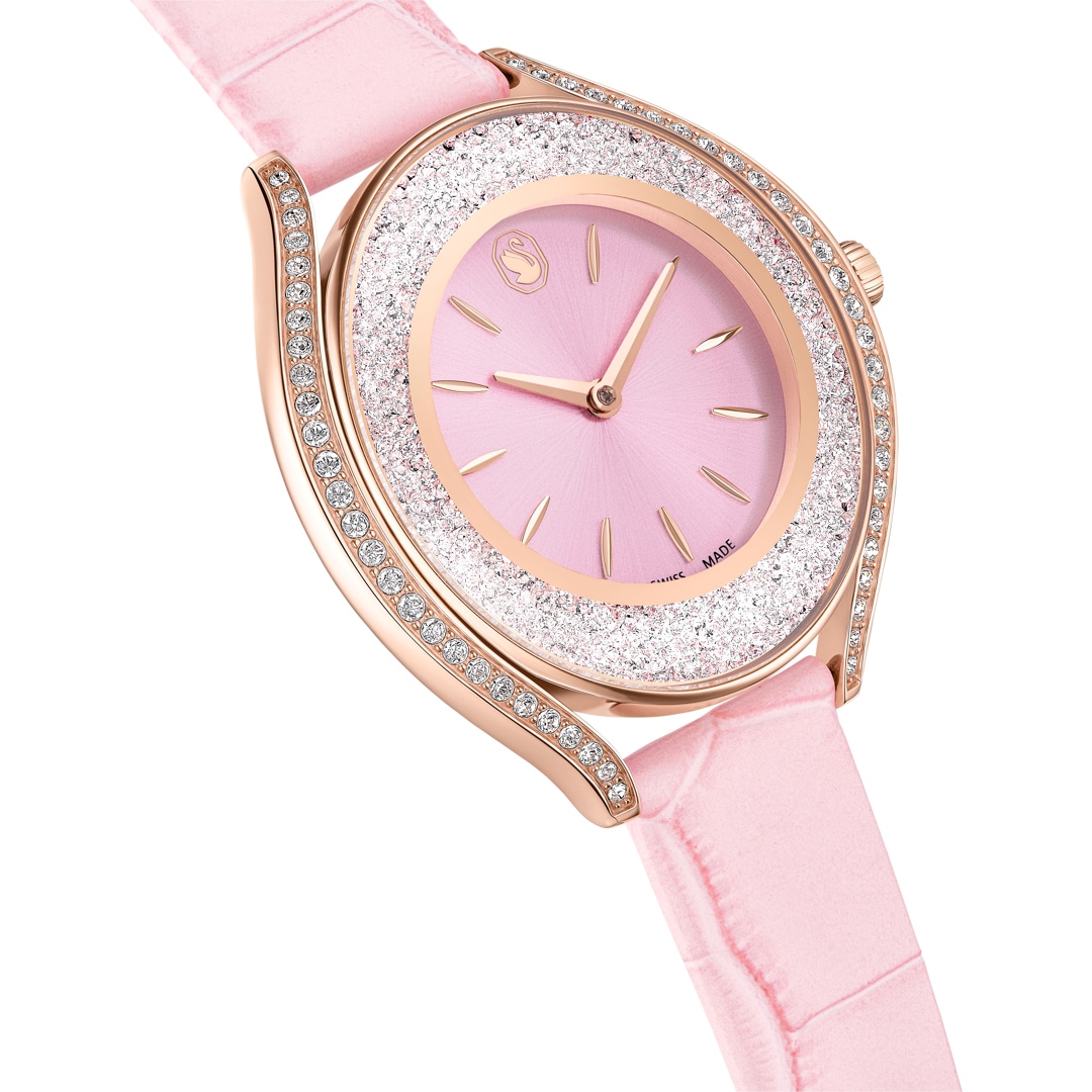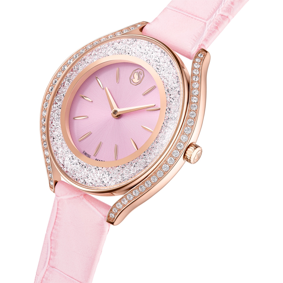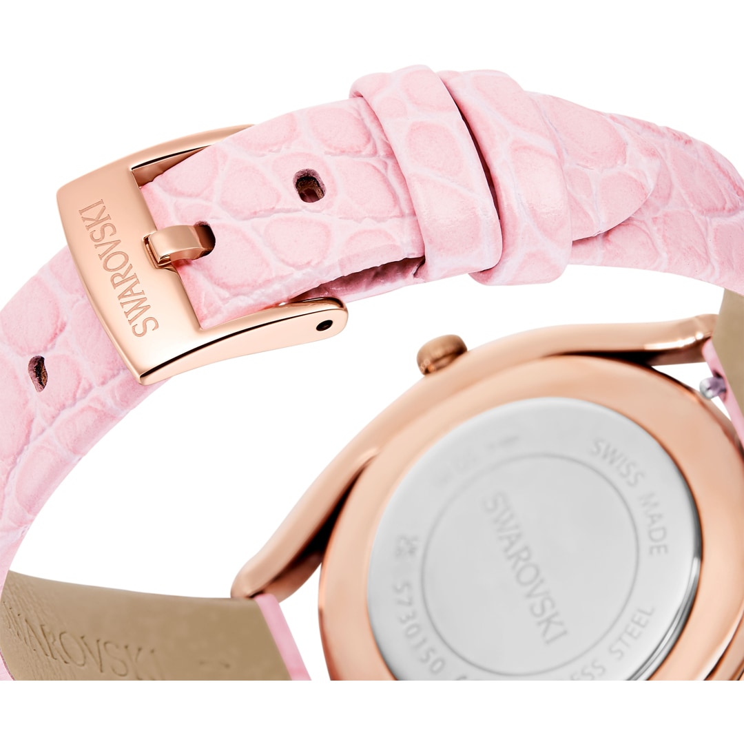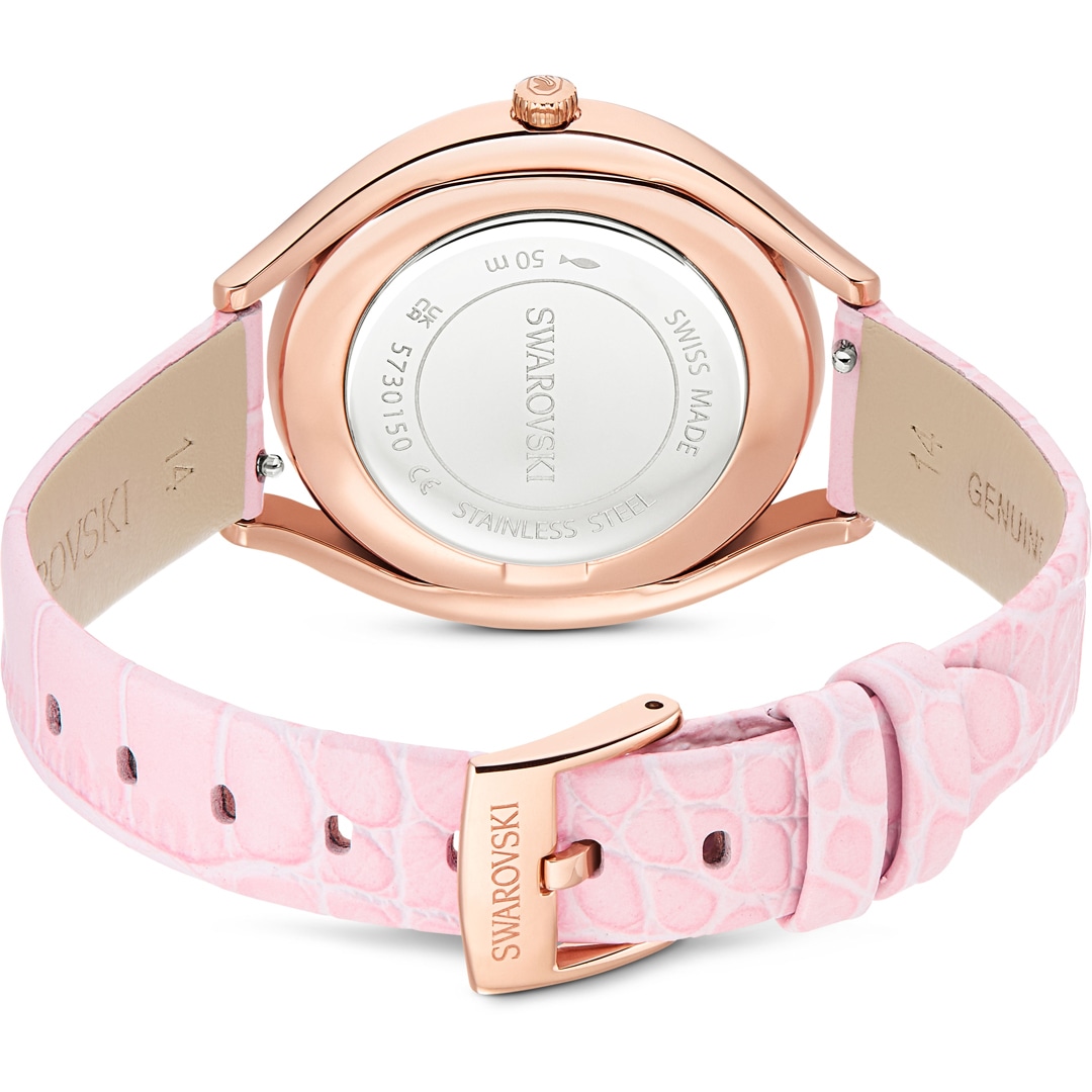 Diese abgerundete Crystalline Armbanduhr kombiniert Eleganz und Funktionalität auf kunstvolle Art und Weise. Rund 1.380 Kristalle rahmen das Gehäuse in einem roségoldfarbenen Finish perfekt ein. Das raffinierte Design wird durch ein rosa Lederarmband, ein Zifferblatt in rosa Sonnenstrahl-Finish und den Swarovski Schwan auf Position 12 abgerundet. Diese Armbanduhr in Swiss Made Qualität ist wasserdicht bis 50 m.