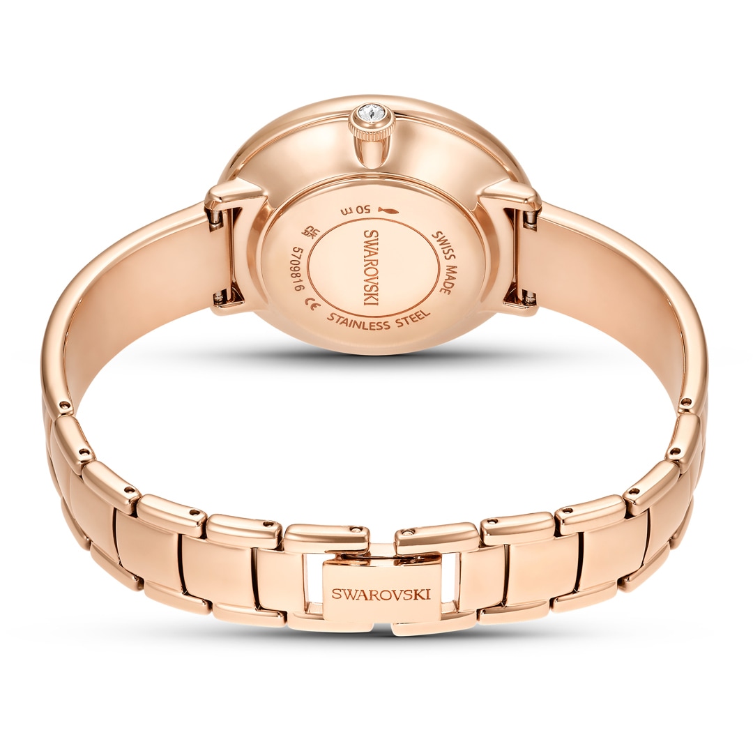 Diese Crystalline Bangle ist Schmuckstück und Zeitmesser zugleich – ein strahlendes Accessoire für jeden Tag. Das 32 mm grosse Edelstahlgehäuse in Roségold-Legierungsschicht mit einem verstellbaren Armreif schmiegt sich perfekt an jedes Handgelenk. Die Mitte des Armreifs ist elegant mit weisser Emaille verziert. Das Zifferblatt, ein einzigartiges Beispiel für Swarovskis Crystalline Fülltechnik, schimmert mit rund 1.016 Kristallen, welche die schlanken Stundenindizes und das Schwan-Logo auf Position 12 Uhr wunderschön hervorheben. Auf der Krone glänzt ein zusätzliches Kristallelement. Diese Swiss Made Uhr ist wasserdicht bis 50 Meter und sorgt zu jeder Tageszeit für funkelnden Stil.