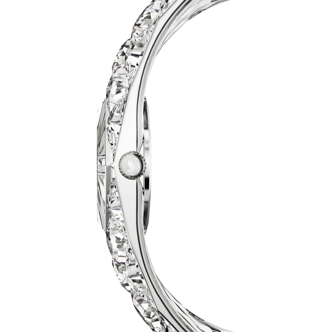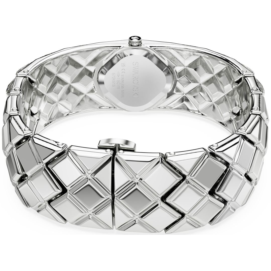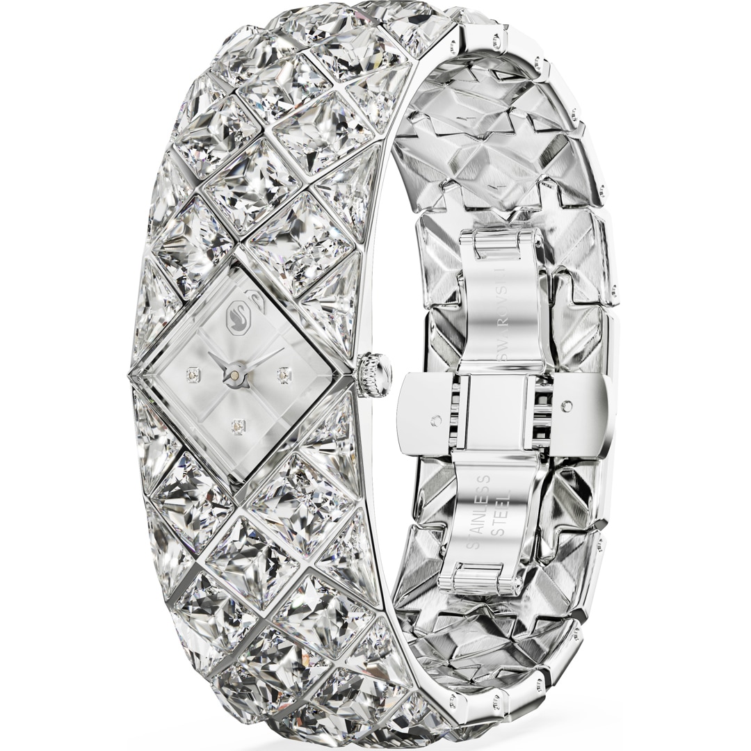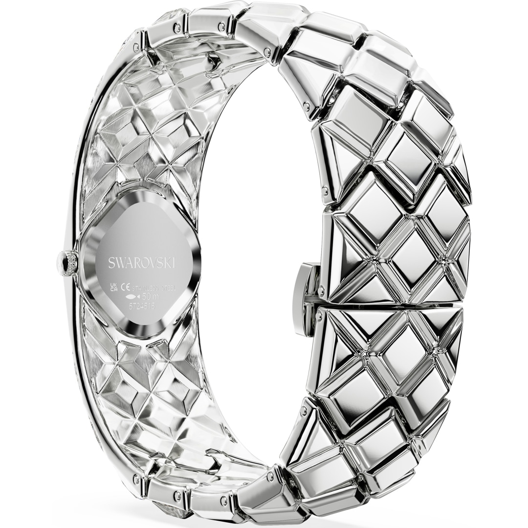 Dieser Zeitmesser mit einem Armreif und insgesamt 47 Kristallen bringt den luxuriösen Esprit von Curiosa i wunderschön zum Ausdruck. Die Kreation ist der beste Beweis für Swarovskis Kulturschatz und Savoir-faire. Das Design in Edelstahl ist eine Hommage an vergangene Epochen und präsentiert ein 20 mm (B) x 20,5 mm (L) grosses Gehäuse, das perfekt in den atemberaubenden Armreif mit Kristallen im Triangle- und Fancy-Schliff integriert ist. Auf den Positionen 3, 6 und 9 des Zifferblatts schimmern Kristallindizes und auf der Position 12 glänzt Swarovskis charakteristisches Schwan-Logo. Das strahlende Accessoire für die elegantesten Anlässe ist wasserdicht bis 50 Meter.