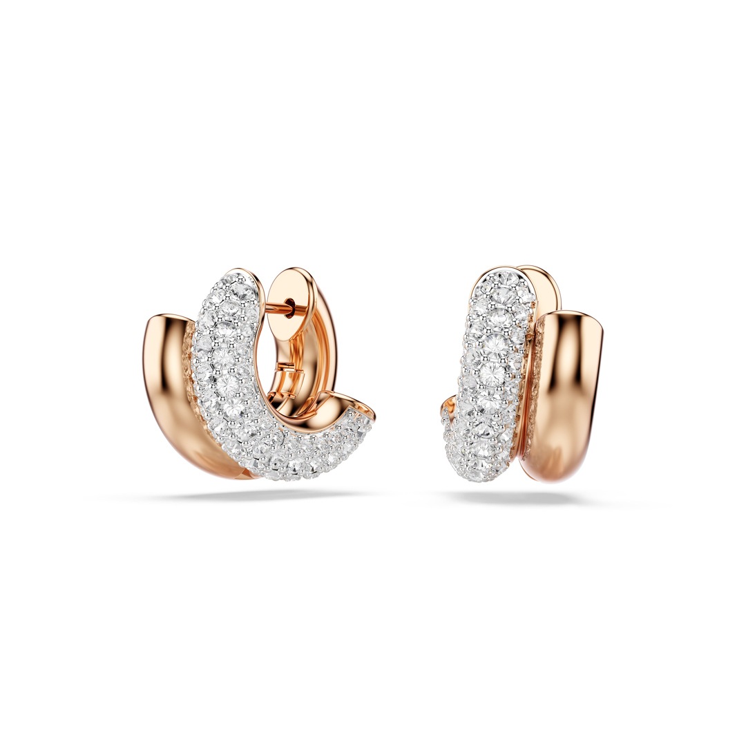 Dieses abgerundeten Ohrringe verkörpern den feinmechanischen Stil von Dextera und vereinen das Finish in Roségold-Legierungsschicht mit klarem Kristallpavé auf einer Seite. Der spezielle Federschnappverschluss erleichtert das Öffnen und Schliessen dieser Minikreolen, die das Umstylen vom Tag zum Abend unverkennbar einfach machen.