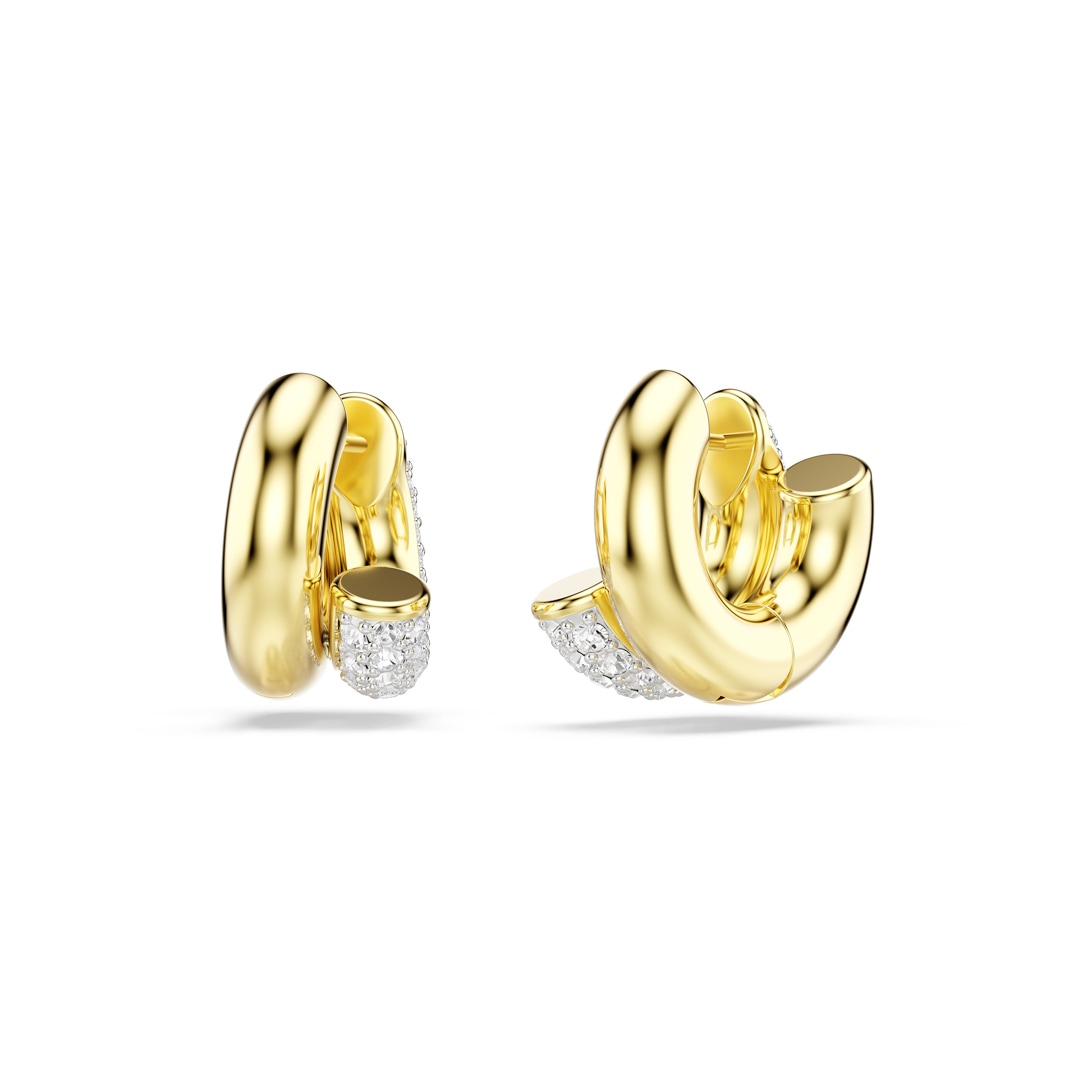 Dieses abgerundeten Ohrringe verkörpern den feinmechanischen Stil von Dextera und vereinen das Finish in Goldlegierungsschicht mit klarem Kristallpavé auf einer Seite. Der spezielle Federschnappverschluss erleichtert das Öffnen und Schliessen dieser Minikreolen, die das Umstylen vom Tag zum Abend unverkennbar einfach machen.