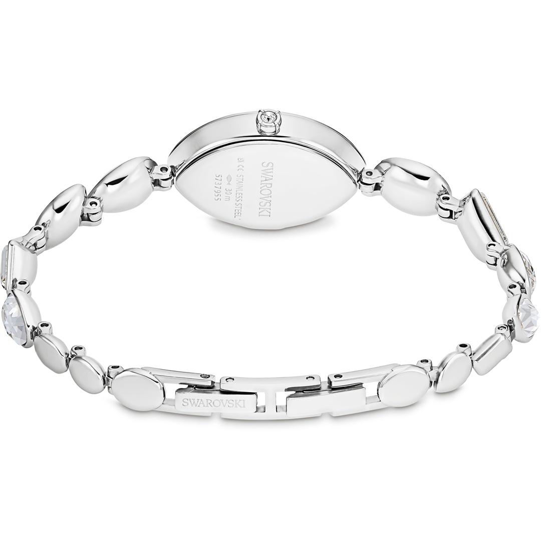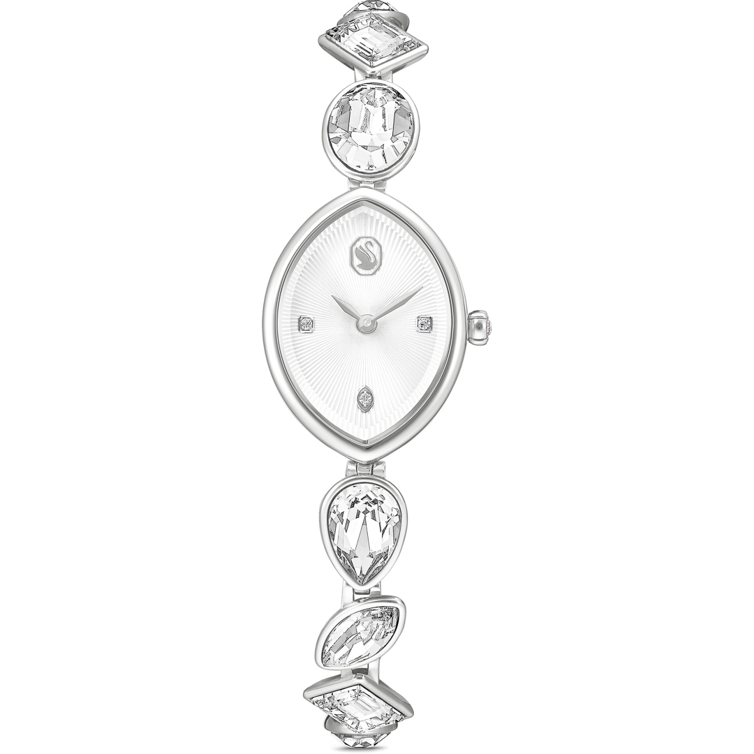 Diese Swarovski Armbanduhr ist von der Gema Schmuckfamilie inspiriert und wirkt mit einer fesselnden Kollision der Formen. Das mandelförmige Edelstahl-Gehäuse glänzt mit einem Guilloche-Zifferblatt, auf dem drei Kristallindexe und ein elegantes Schwan-Logo strahlen. Das verstellbare Armband mit acht verschiedenen Kristallen in vielen Schliffen schmiegt sich perfekt an jedes Handgelenk. Die Uhr ist wasserdicht bis 50 m und eine verspielte Möglichkeit, Ihrem Styling strahlende Geometrie zu verleihen.