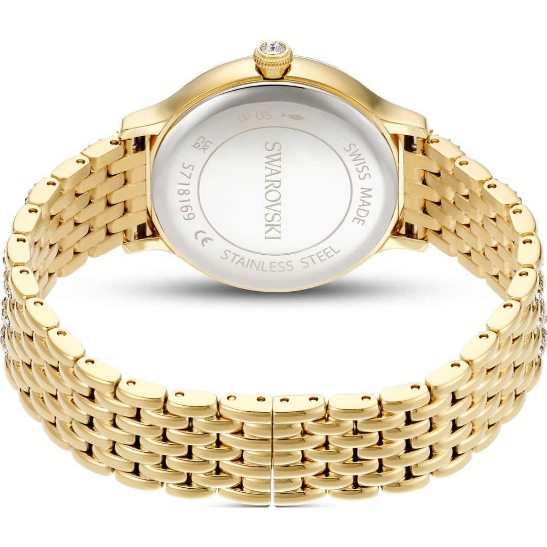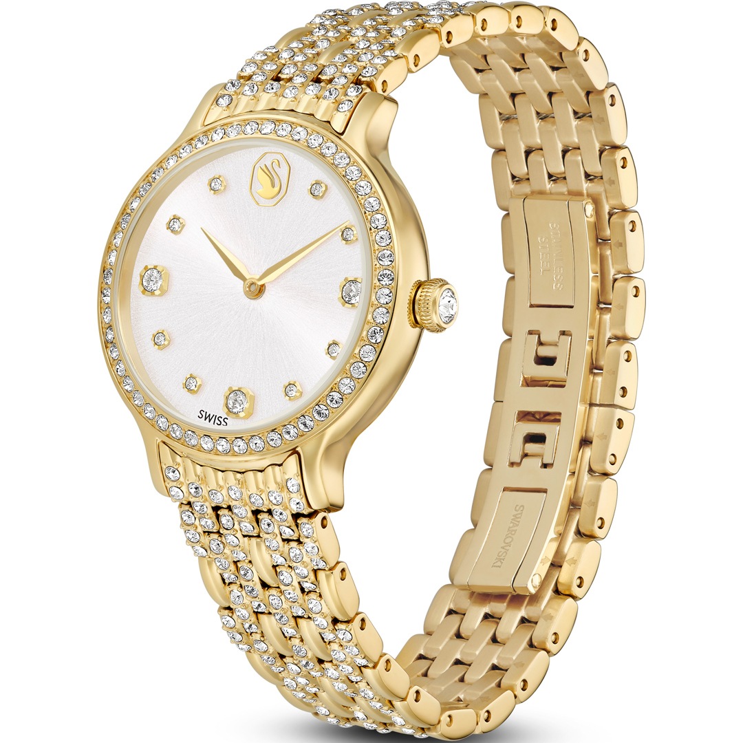 Diese schimmernde Imber Armbanduhr mit 232 einzelnen Kristallen ist Swarovskis schönster Ausdruck zeitloser Eleganz. Das 31 mm grosse Edelstahldesign in Goldlegierungsschicht präsentiert eine Lünette mit 52 klaren Pavé-Kristallen und ein weiteres Kristallelement in der Krone. 11 verschieden grosse Kristalle markieren die Stunden auf dem Zifferblatt in einem herrlichen Sonnenstrahl-Finish. Das Schwan-Logo glänzt auf Position 12. Das auffallendste Merkmal dieser Uhr ist das verstellbare Armband mit sieben Gliedern, das mit 168 prachtvollen Kristallen im Rundschliff besetzt ist. Diese Swiss Made Uhr ist wasserdicht bis 50 Meter und passt perfekt zu den Imber Schmuckstücken von Swarovski.