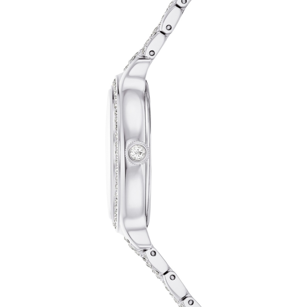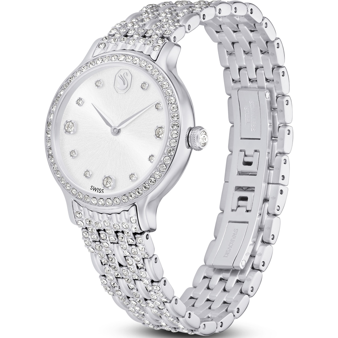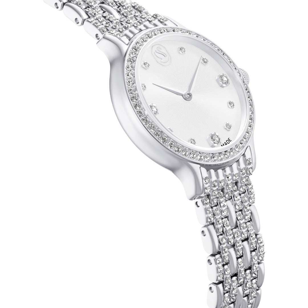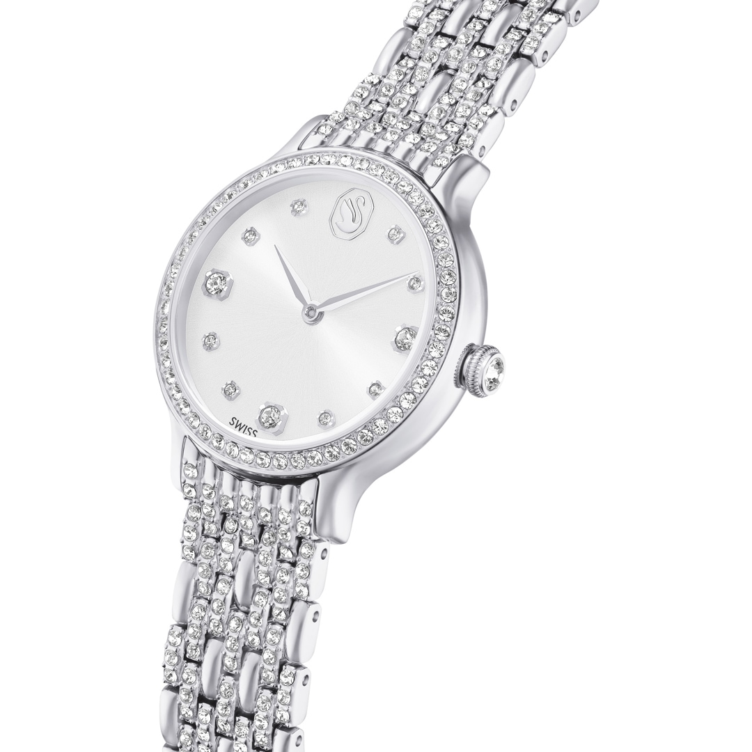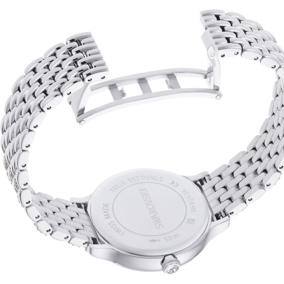 Diese schimmernde Imber Armbanduhr mit 232 einzelnen Kristallen ist Swarovskis schönster Ausdruck zeitloser Eleganz. Das 31 mm grosse Design in Edelstahl präsentiert eine Lünette mit 52 klaren Pavé-Kristallen und ein weiteres Kristallelement in der Krone. 11 verschieden grosse Kristalle markieren die Stunden auf dem Zifferblatt in einem herrlichen Sonnenstrahl-Finish. Das Schwan-Logo glänzt auf Position 12. Das auffallendste Merkmal dieser Uhr ist das verstellbare Armband mit sieben Gliedern, das mit 168 prachtvollen Kristallen im Rundschliff besetzt ist. Diese Swiss Made Uhr ist wasserdicht bis 50 Meter und passt perfekt zu den Imber Schmuckstücken von Swarovski.