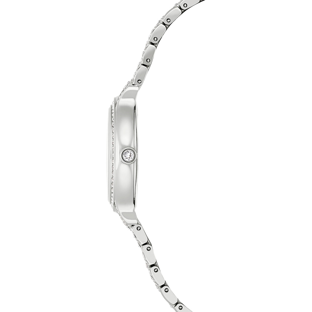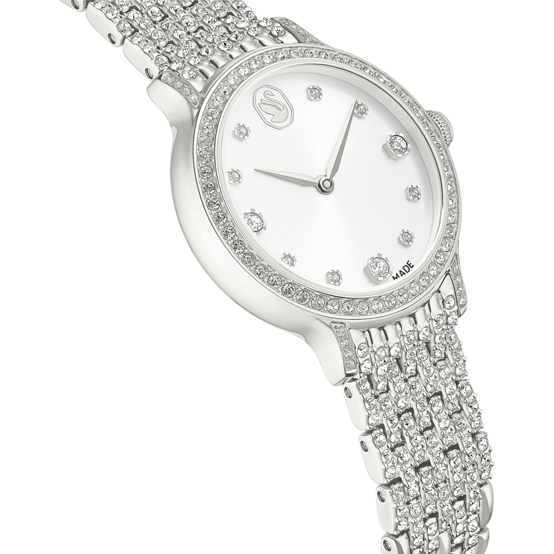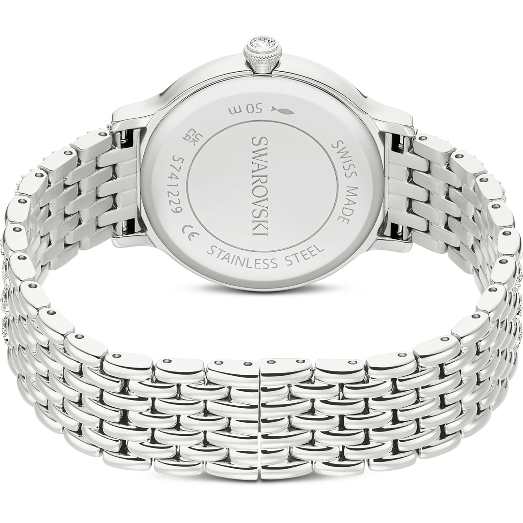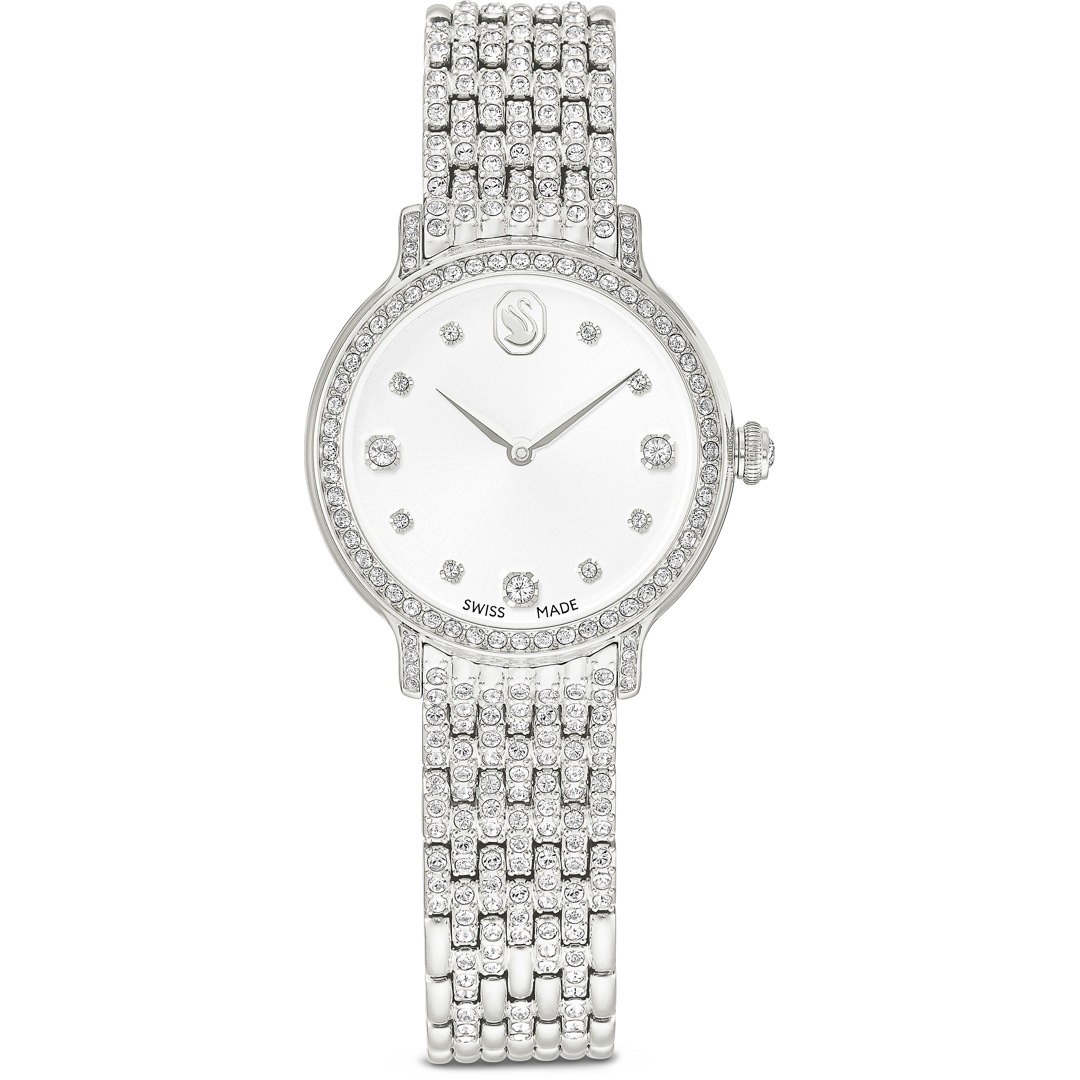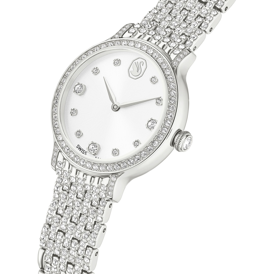 Diese 31 mm grosse Armbanduhr in Edelstahl ist von der Kombination aus Metall und Kristallen inspiriert, die in der Imber Schmuckfamilie perfekt zur Geltung kommt. Die Pavé-Lünette ist mit 68 Kristallen besetzt, während weitere 198 Kristalle das siebengliedrige Armband zieren. Zusätzlichen Glanz bietet das helle Zifferblatt im Sonnenstrahl-Finish mit Kristallindexen und dem edlen Schwan-Logo auf Position 12. Diese elegante Armbanduhr in Swiss Made Qualität ist bis 50 m wasserdicht.