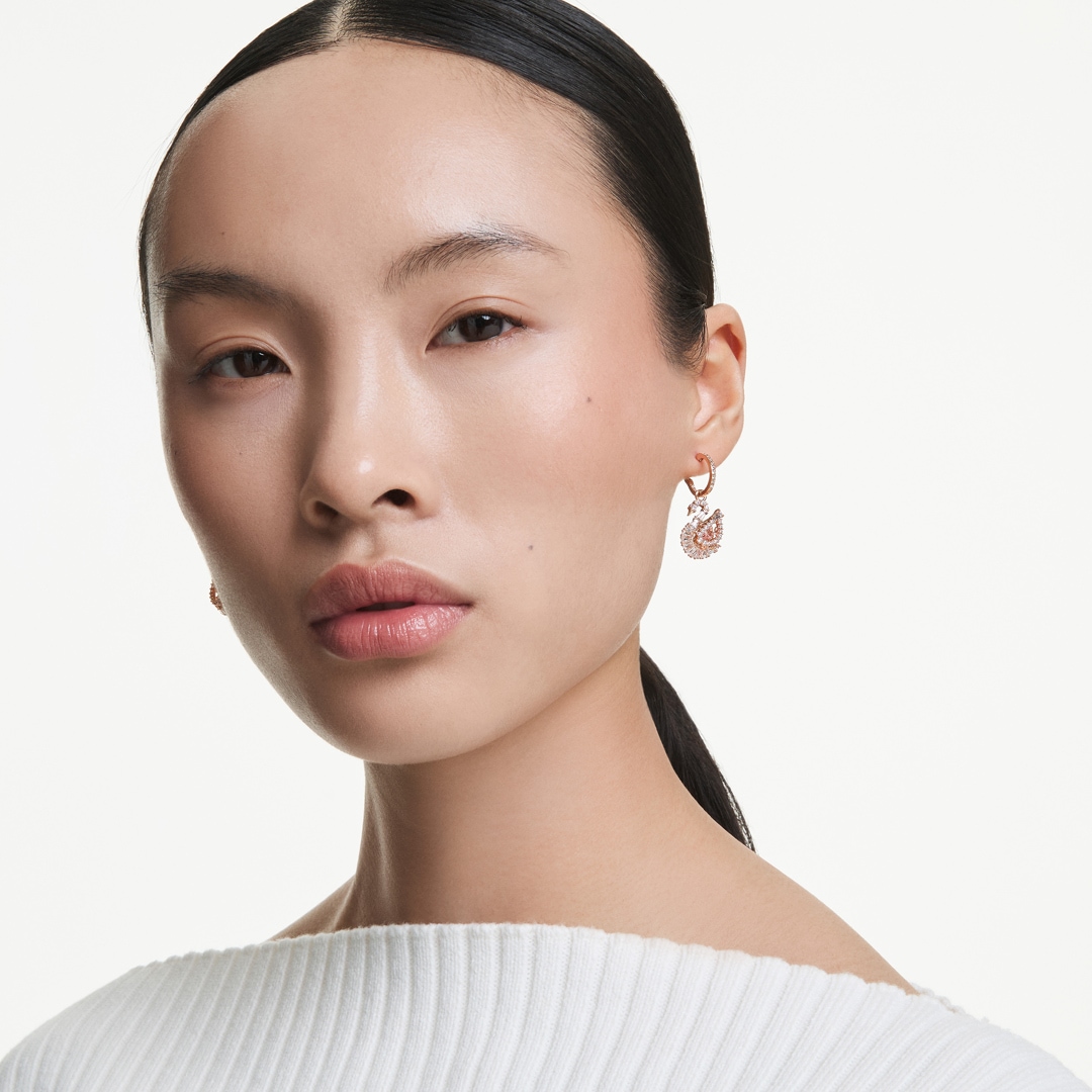 Mit diesen emblematischen Ohrringen holen Sie sich zarte Bewegung und den ikonischen Swarovski Schwan in Ihren Look. Die anmutigen Silhouetten in Roségold-Legierungsschicht schwingen an Mini-Kreolen in schimmerndem Pavé und werden von klarem Swarovski Zirconia sowie einem pinkfarbenen Dancing Stone im Körper eines jeden Schwans abgerundet. Dieses strahlende Detail erzeugt ein schier endloses Spiel der Farbe und des Lichts und lässt Ihr Styling hell erstrahlen.