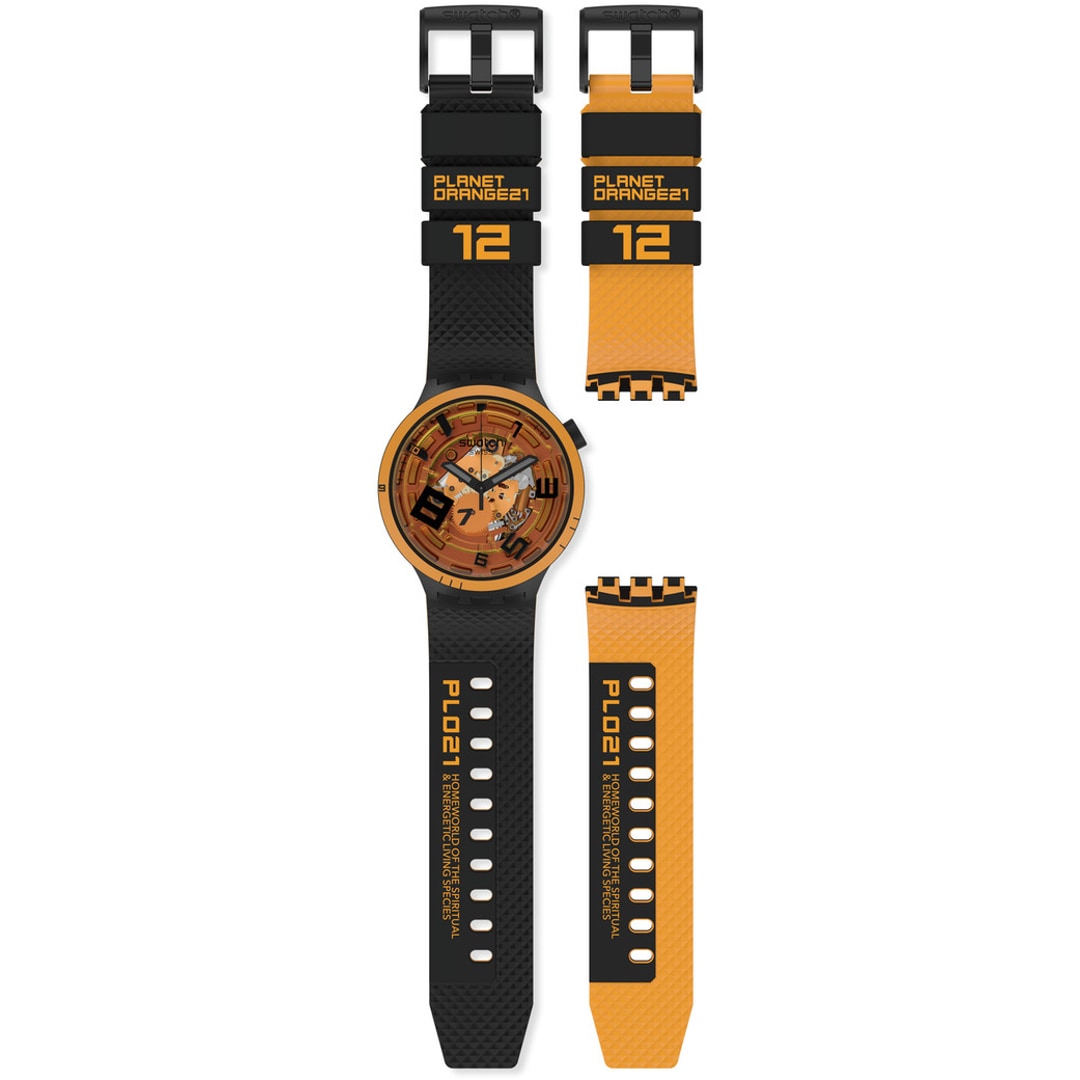 Dieses Design zeichnet sich durch ein mattes BiCompression-Silikonarmband in kühnem Schwarz und Orange aus, während das zweite Armband in der Spezialverpackung für einen noch eindrucksvolleren Look sorgt. Das transparente Zifferblatt mit mehrfarbigem Print lässt Zifferblatt und Zeiger im Swatch Glow erstrahlen.